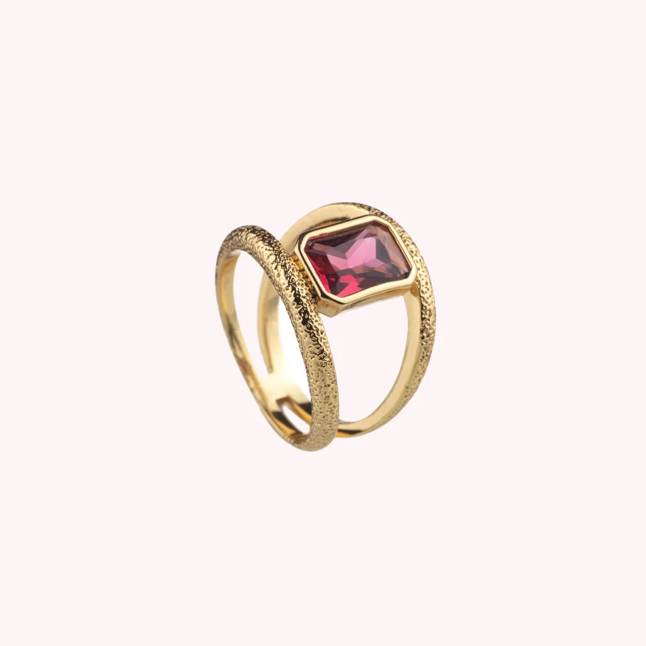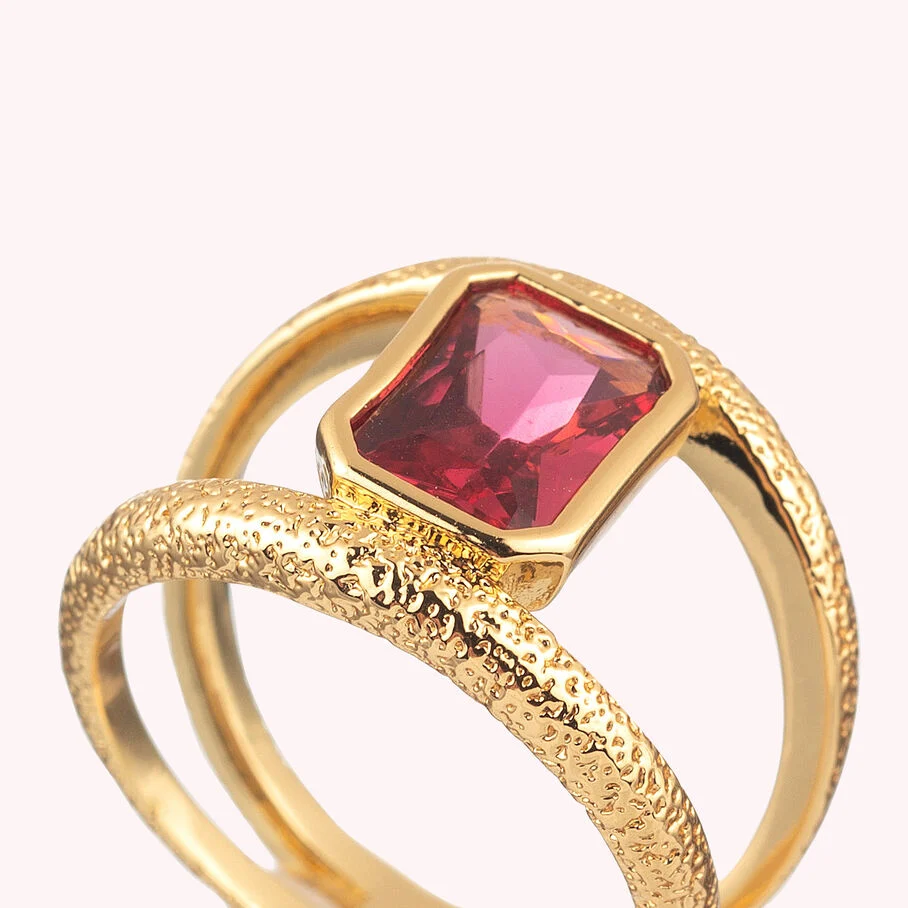 Anillo ancho y hueco acabado en oro de 18k con circonita verde o rosa en talla esmeralda. Un anillo con presencia, muy fácil de combinar y que podrás lucir en cualquier época del año. El toque perfecto de luz y color para unos outfits definidos y tendencia. Potencia la diosa que llevas dentro con lo nuevo de Maria Pombo X Agatha Paris.