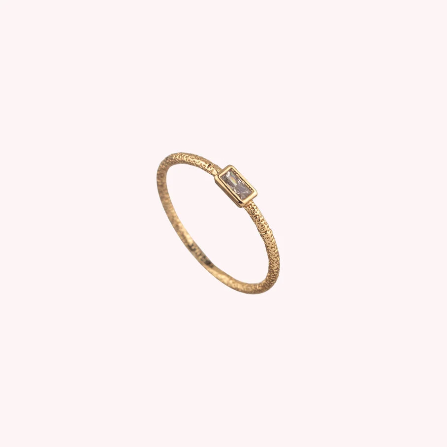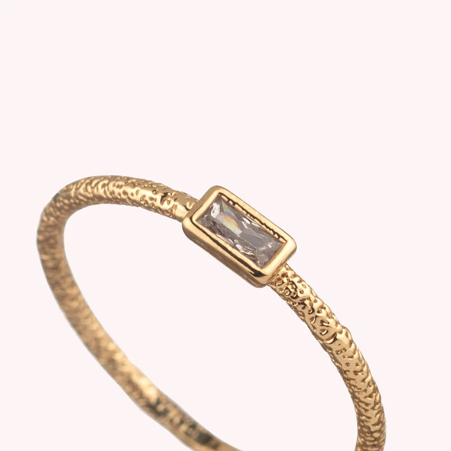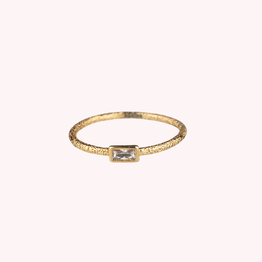 Anillo fino acabado en oro de 18k con circonita blanca, verde o rosa en talla baguette. Un anillo fácil de combinar, que invita a la acumulación y que podrás lucir en cualquier época del año. El toque perfecto de luz y color para unos outfits definidos y tendencia. Potencia la diosa que llevas dentro con lo nuevo de Maria Pombo X Agatha Paris.