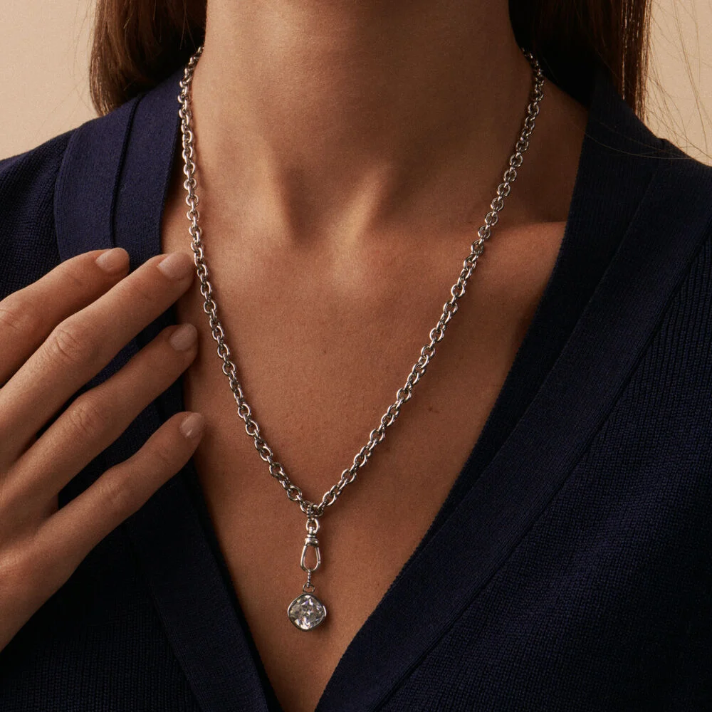 Colgante de circonita transparente, verde, azul o negra. Un amuleto de luz perfecto para combinar con el resto de colgantes de la colección. Es la pieza clave para elevar tus looks y darles un brillo increíble. Crea tu collar personalizado con los amuletos de moda de la nueva colección de Maria Pombo X AGATHA. Joya acabada en rodio.