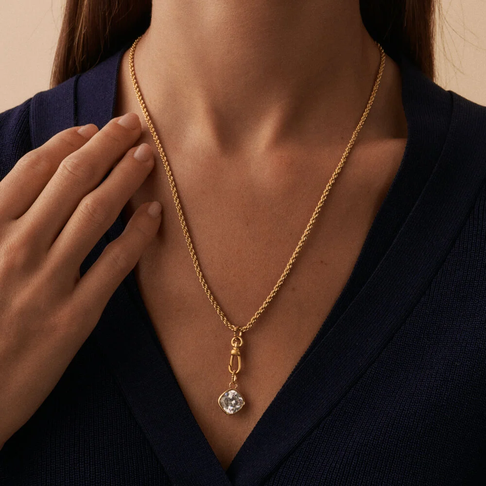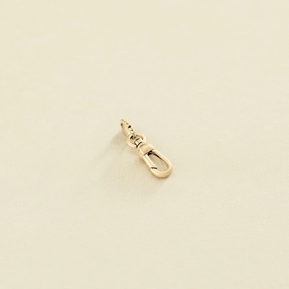 Mosquetón bañado en oro ideal para lucir tus colgantes a diferentes alturas y que se vean todos bien. Con esta pieza podrás crear tu collar personalizado con los amuletos de moda de la nueva colección de Maria Pombo X AGATHA.