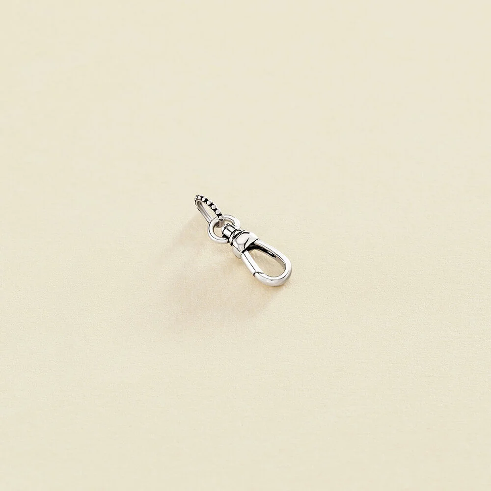 Mosquetón bañado en rodio ideal para lucir tus colgantes a diferentes alturas y que se vean todos bien. Con esta pieza podrás crear tu collar personalizado con los amuletos de moda de la nueva colección de Maria Pombo X AGATHA.