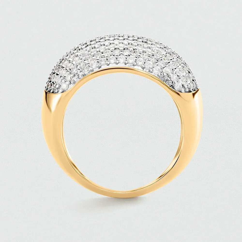 El anillo ancho Danae de Agatha Paris es una pieza de impacto pensada para convertirse en protagonista absoluto de la mano. Realizado en metal con acabado dorado, está completamente cubierto de circonitas que crean una superficie brillante y uniforme. Su diseño tipo banda, en talla 56, envuelve el dedo con un efecto joya contundente y elegante, perfecto para ocasiones especiales o para quienes aman los anillos llamativos.