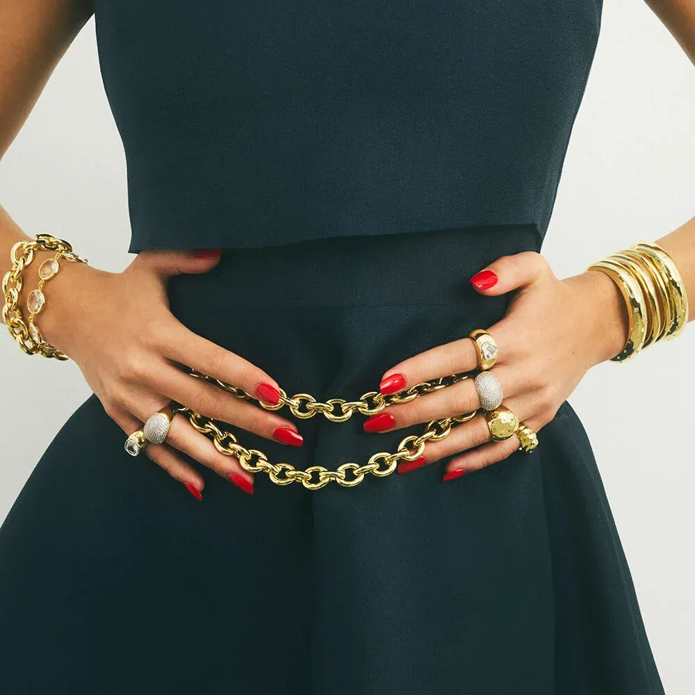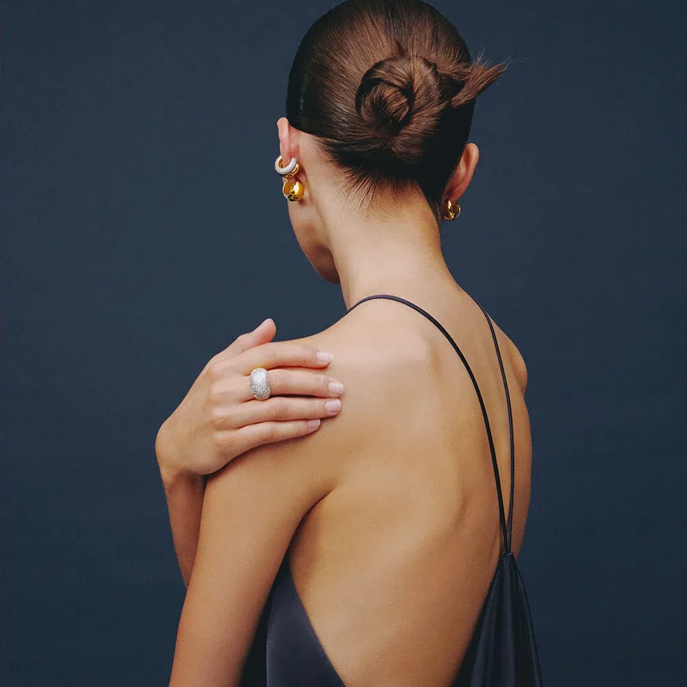 Puede llevarse solo en el dedo corazón o índice para maximizar su presencia, o combinarse con anillos finos en otros dedos para un look más elaborado. Es una opción ideal para elevar rápidamente un conjunto sencillo de camisa blanca y vaqueros o para completar un estilismo de noche.