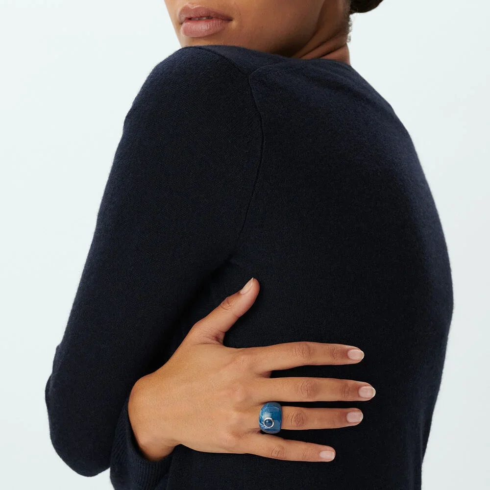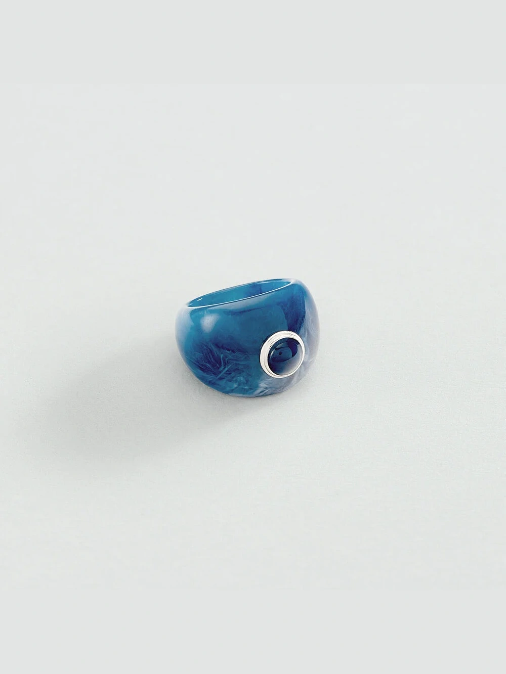 Sortija de acetato con cabujón en tonalidad azul coordinada con la base. Diseño irresistible de la colección BE by María Pombo imposible de resistir esta temporada. Esta joya se convertirá en la pieza protagonista que todo el mundo querrá lucir. Perfecto para combinar con collar largo y criollas en el mismo tono creando match total. Anillo francés con personalidad única y estilo inconfundible.