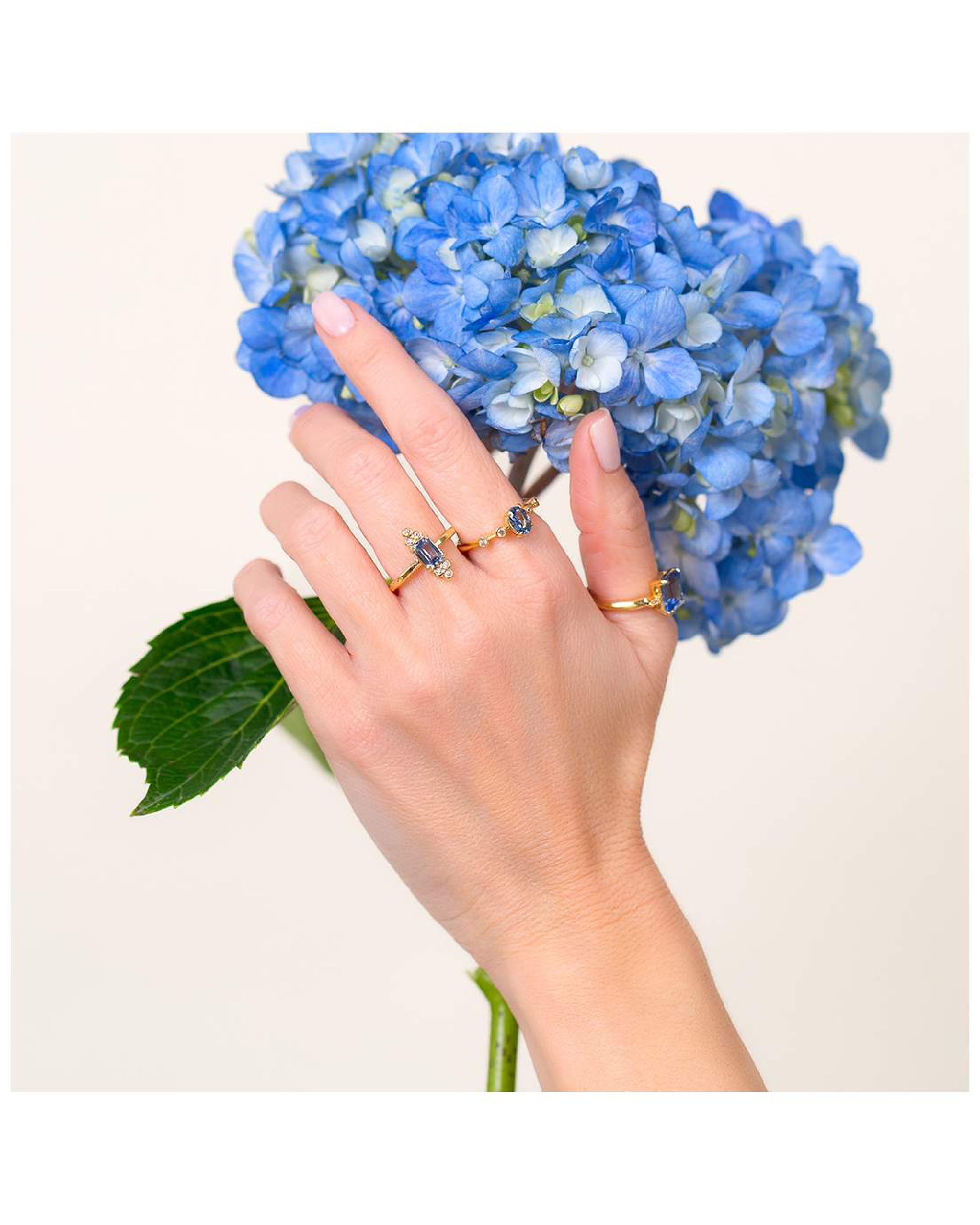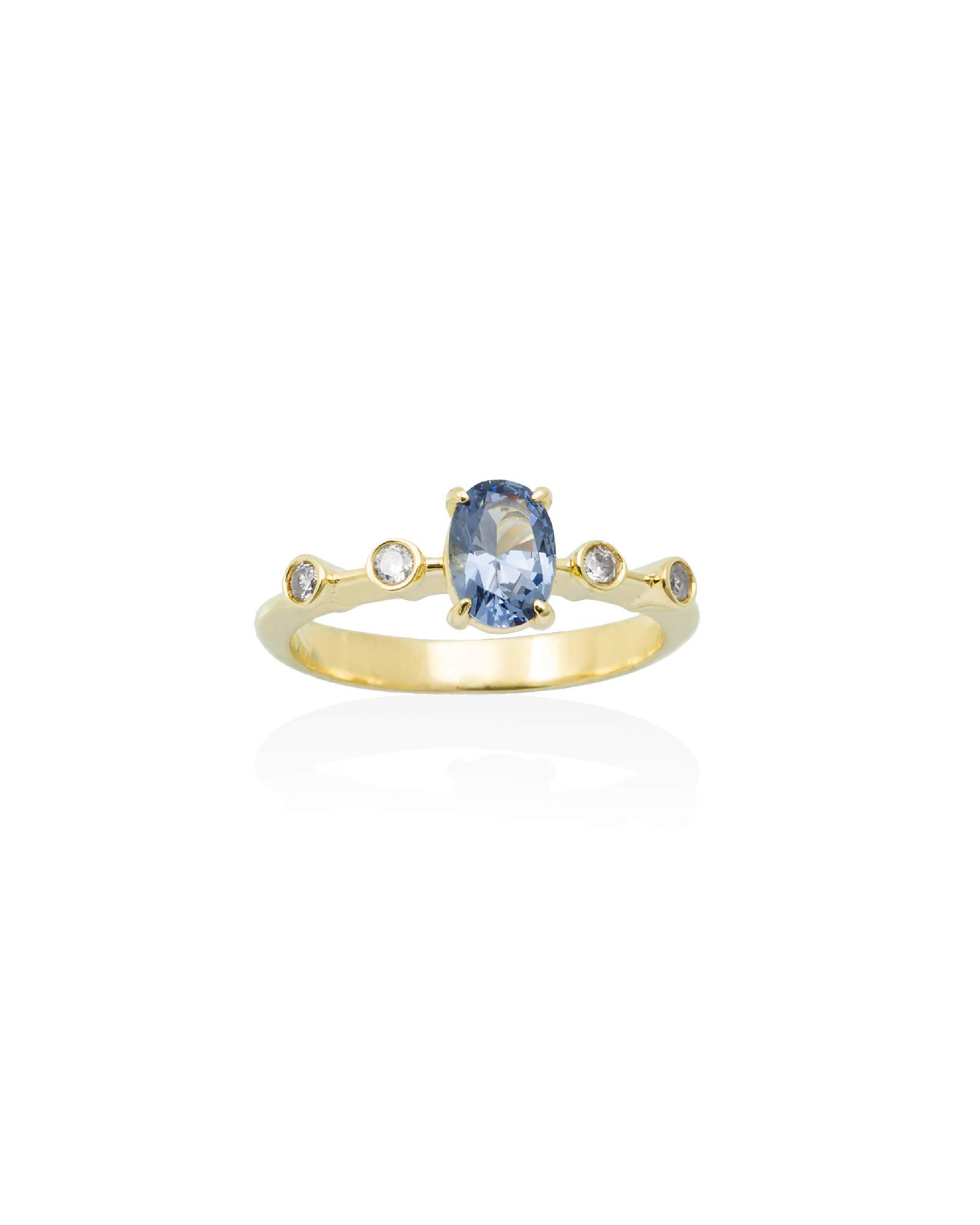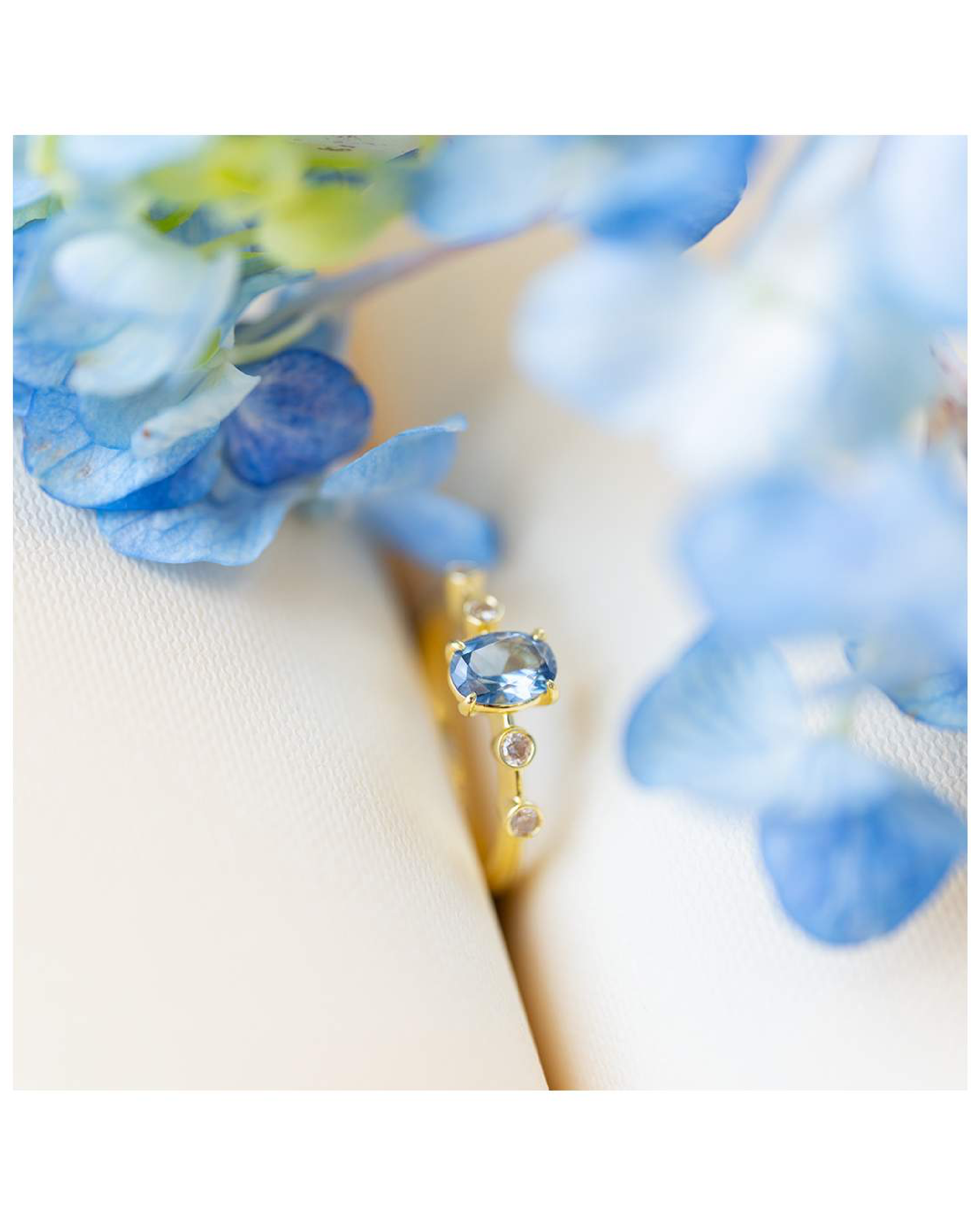 Anillo de plata de primera ley (925) chapada en oro amarillo de 18kt con circonita blanca y piedra sintetica color azul.
