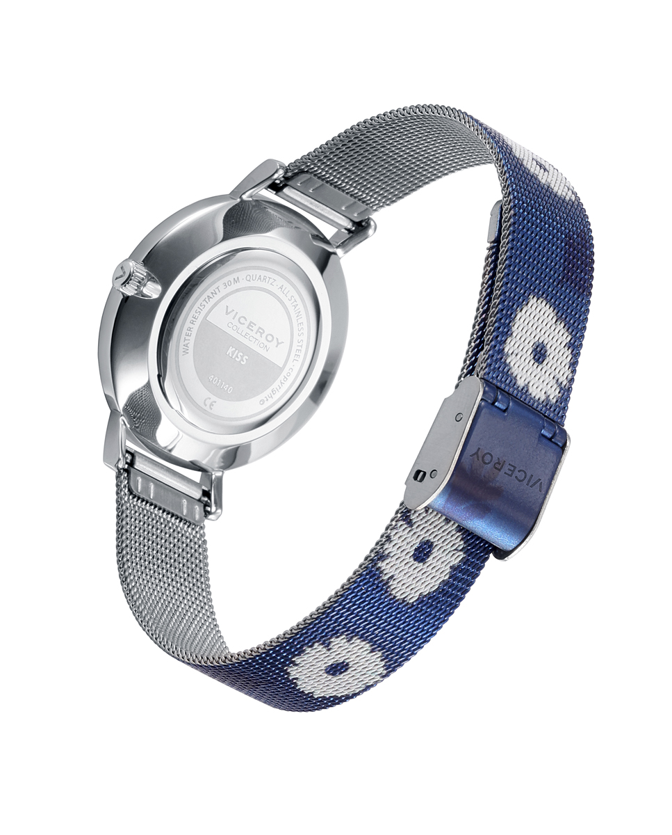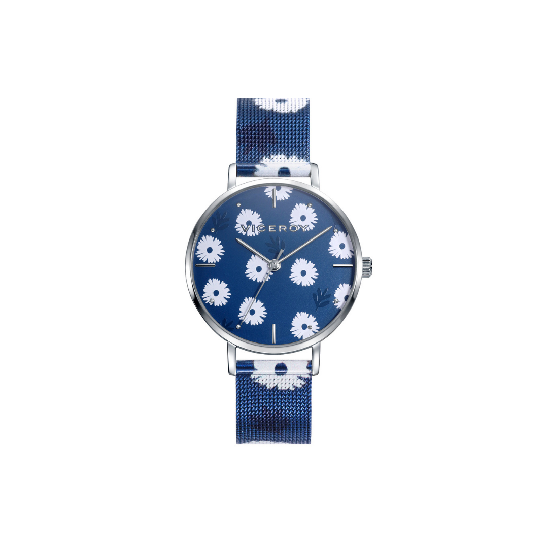 Reloj de Mujer Viceroy Kiss, tres agujas, caja en acero y malla milanesa azul con dibujos de flores. Esfera azul con dibujos de margaritas y agujas en acero.