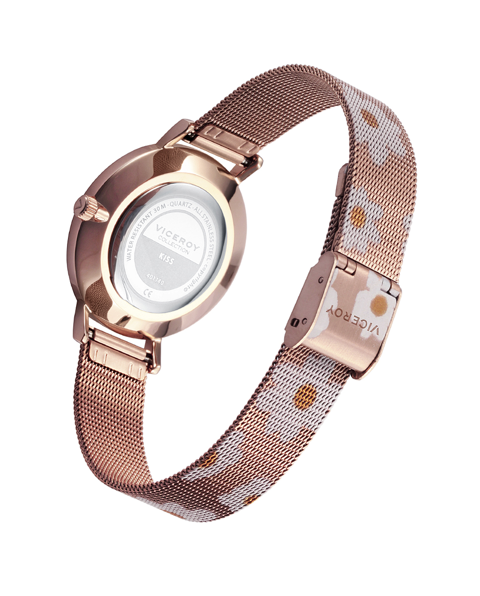 Reloj de Mujer Viceroy Kiss, tres agujas, caja en acero y malla milanesa rosada con dibujos de flores. Esfera rosada con dibujos de margaritas y agujas en acero.