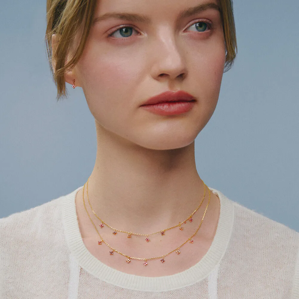Collar corto de plata de ley con baño de oro rosa y pampillas en forma de flor. Toque romántico y luminoso que realza el escote; perfecto para combinar con pulsera y pendientes a juego.