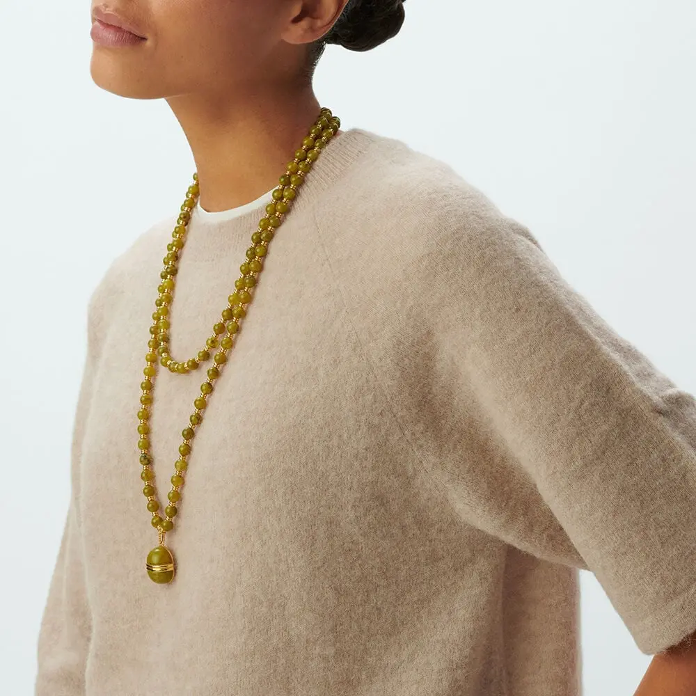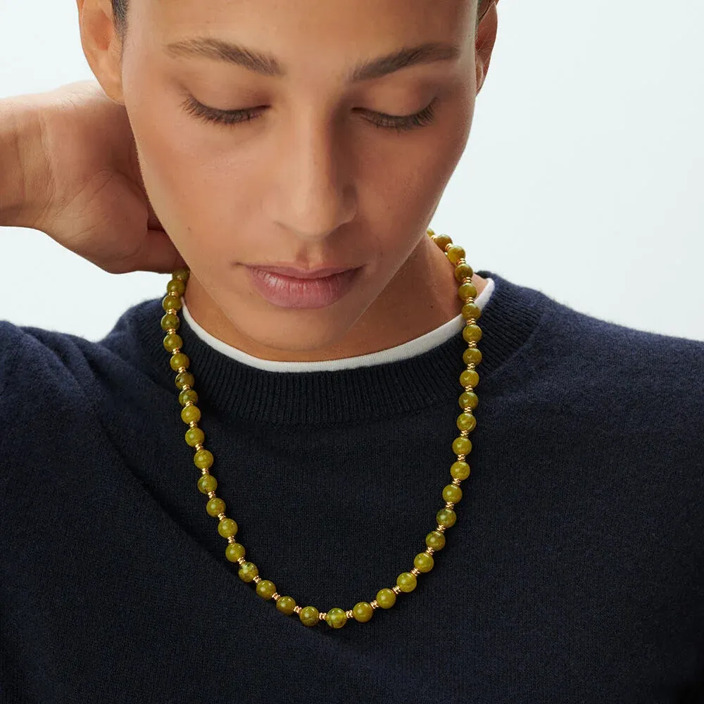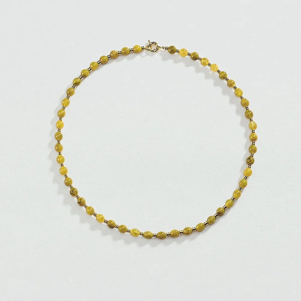 Collar de longitud media elaborado en resina color caqui con cierre dorado elegante. Diseño de la colección BE by María Pombo que aporta personalidad definitiva a todos tus conjuntos. Perfecto para combinar con criollas y anillo a tono creando un look coordinado impactante. Joya que captura miradas con elegancia parisina auténtica. Pieza versátil ideal para múltiples estilos con carácter único.