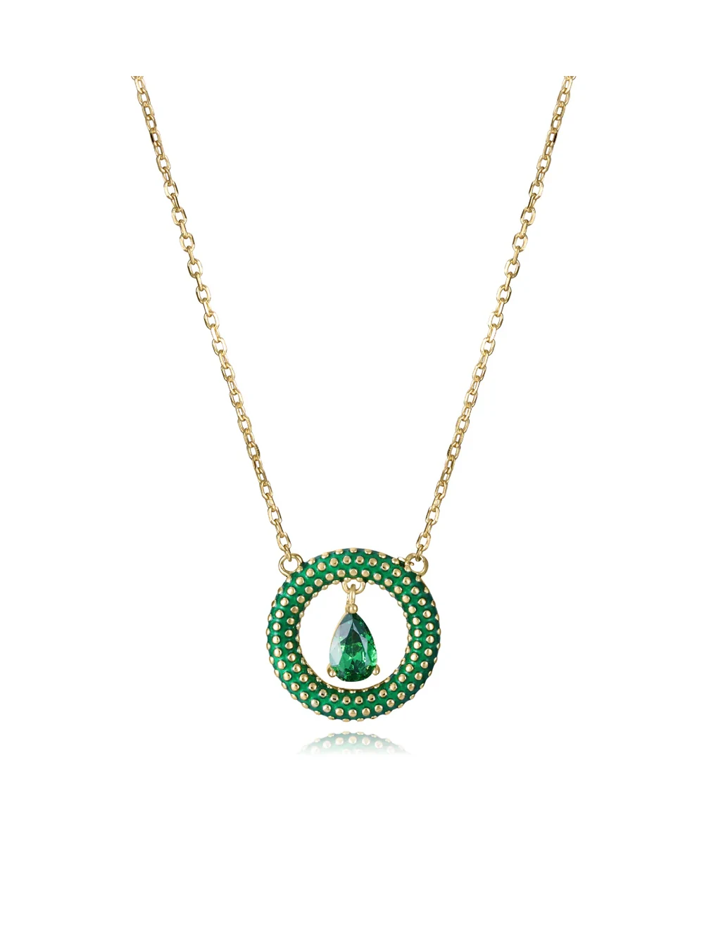 Luce un accesorio que define tu estilo personal con este collar que fusiona la elegancia atemporal de la plata con el glamour del oro. Su colgante destaca por una circonita de tonalidad verde que captura la luz con cada movimiento, mientras que el aro con esmalte del mismo color añade profundidad y personalidad a la pieza.
