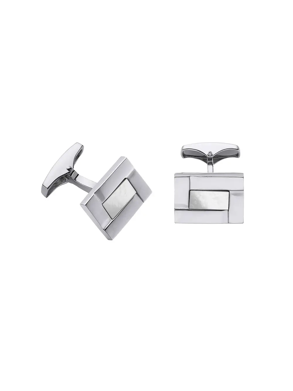 Gemelos de Durán Exquse realizados en plata de ley 925 con acabado en rodio, que incorpora una fina pieza de madreperla. Un accesorio elegante y atemporal para complementar camisas con estilo y sofisticación.