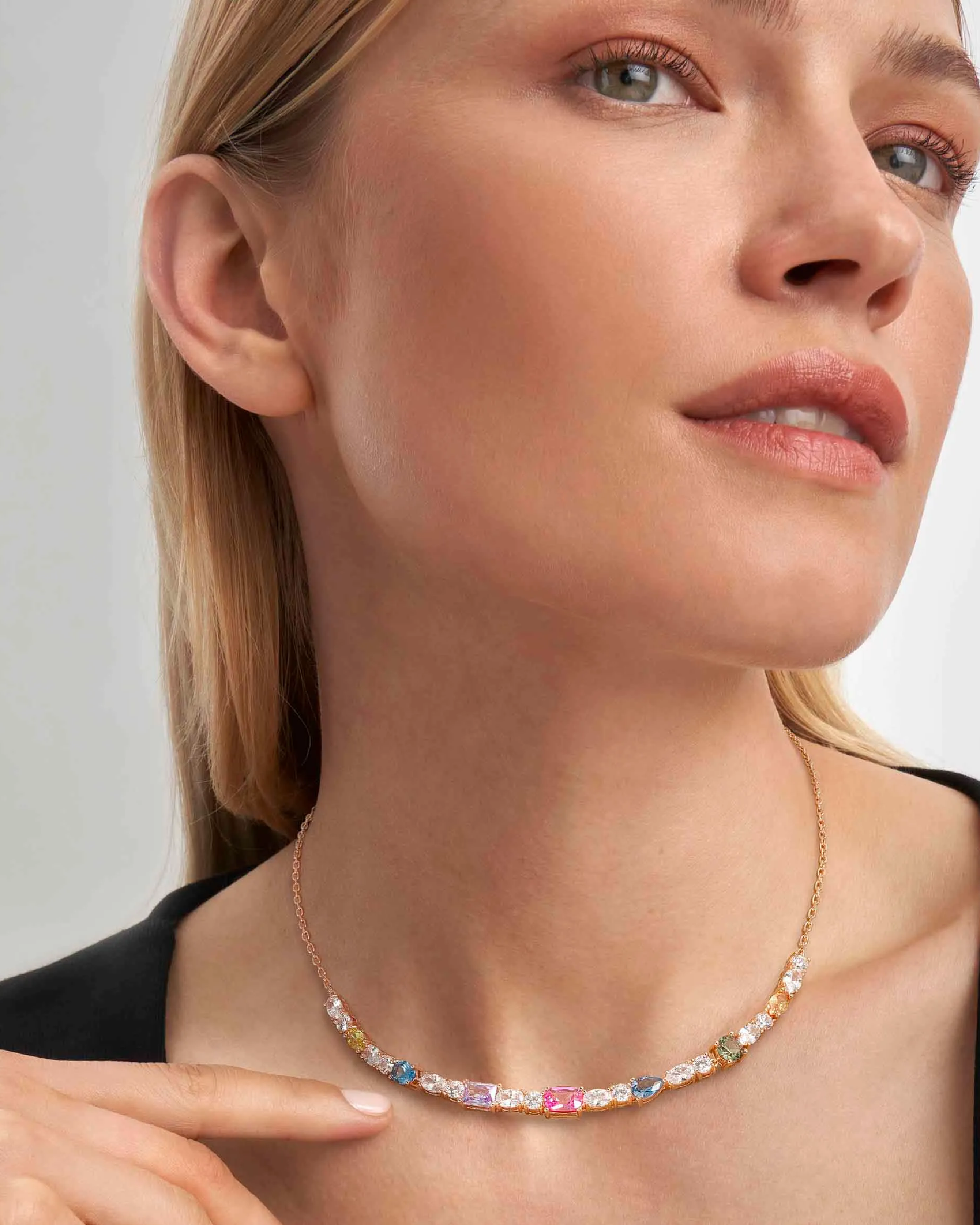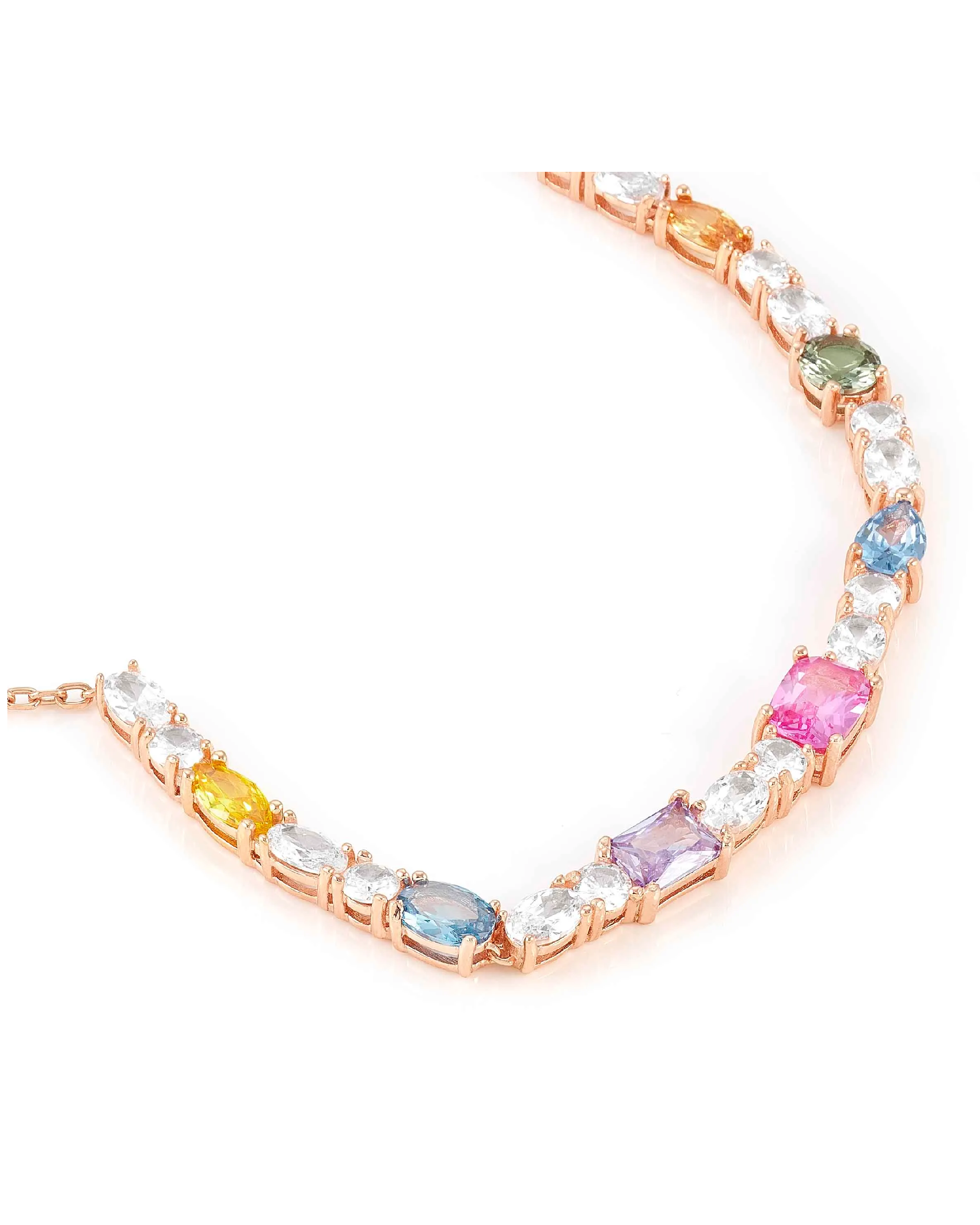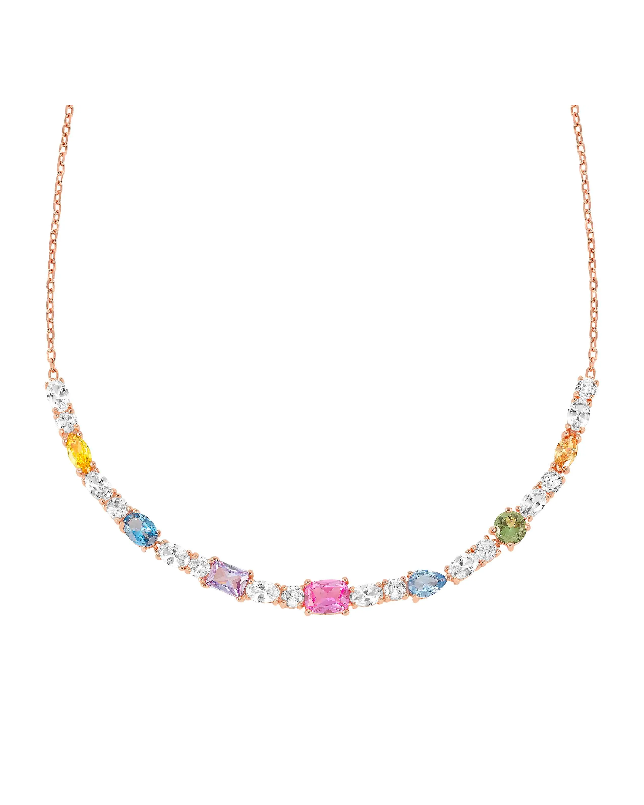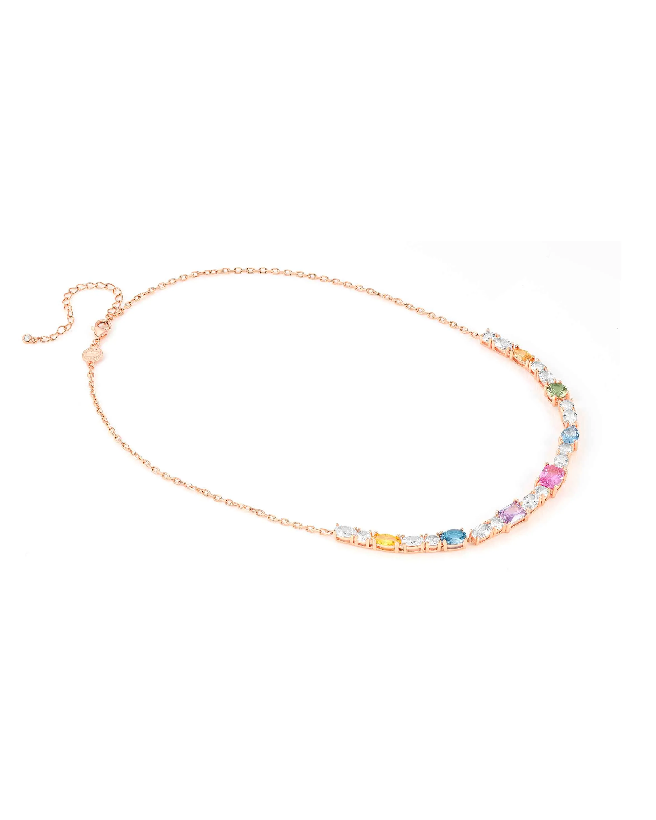 Collar en Plata 925 con Cubic Zirconia en un mix de colores y formas. Disponible con acabado en Rodio blanco o en Oro Rosa realizado mediante baño galvánico. Medida: 44 cm, ajustable a 38 cm. Cierre con Cubic Zirconia. Made in PRC. ¡Una explosión de color!
