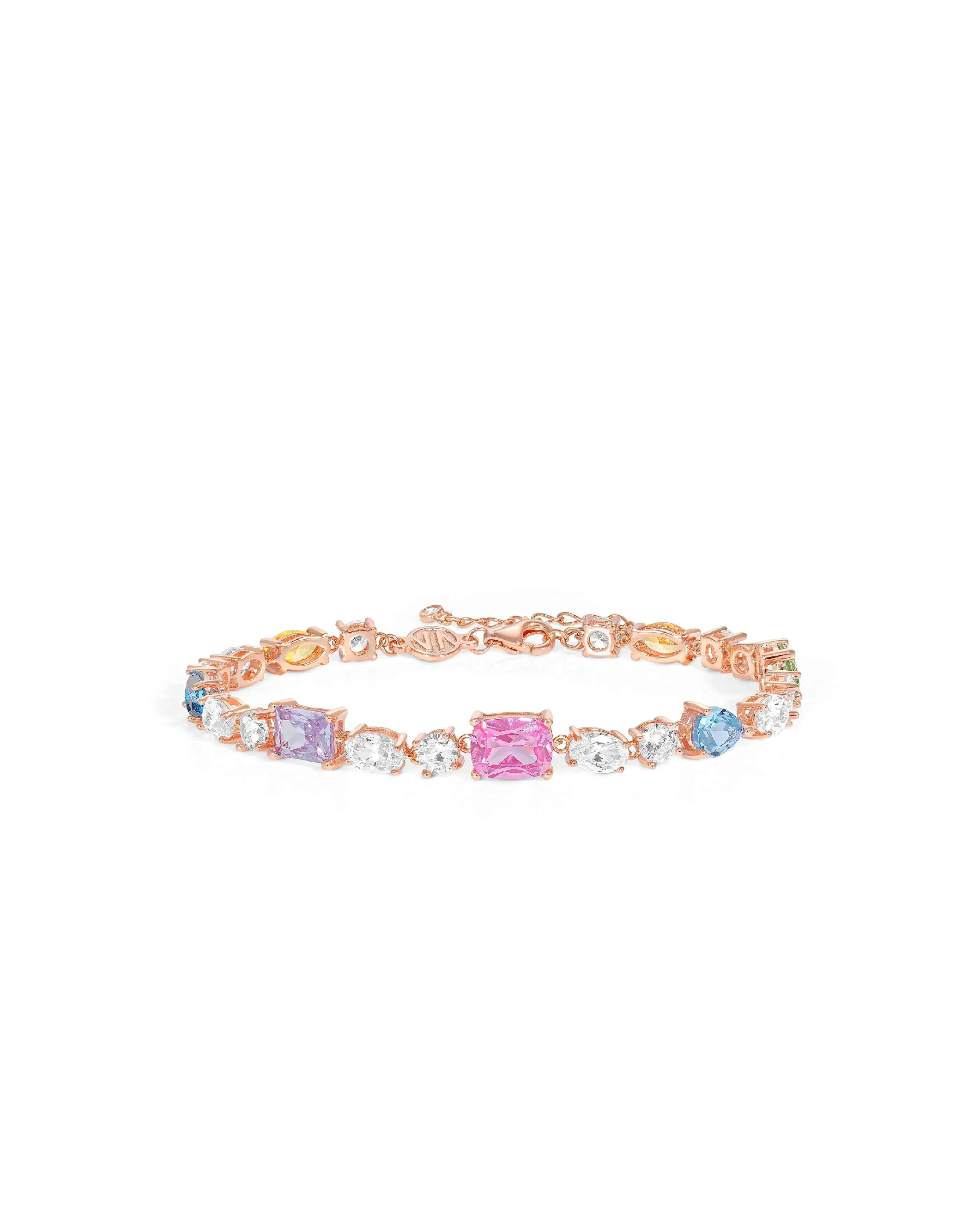 Pulsera en Plata 925 con Cubic Zirconia en un mix de colores y formas. Disponible con acabado en Rodio blanco o en Oro Rosa realizado mediante baño galvánico. Medida: 21 cm, ajustable a 17 cm. Medida elemento central: 1,63×0,6cm. Cierre con Cubic Zirconia. Made in PRC. ¡La pulsera perfecta para llevar siempre contigo!