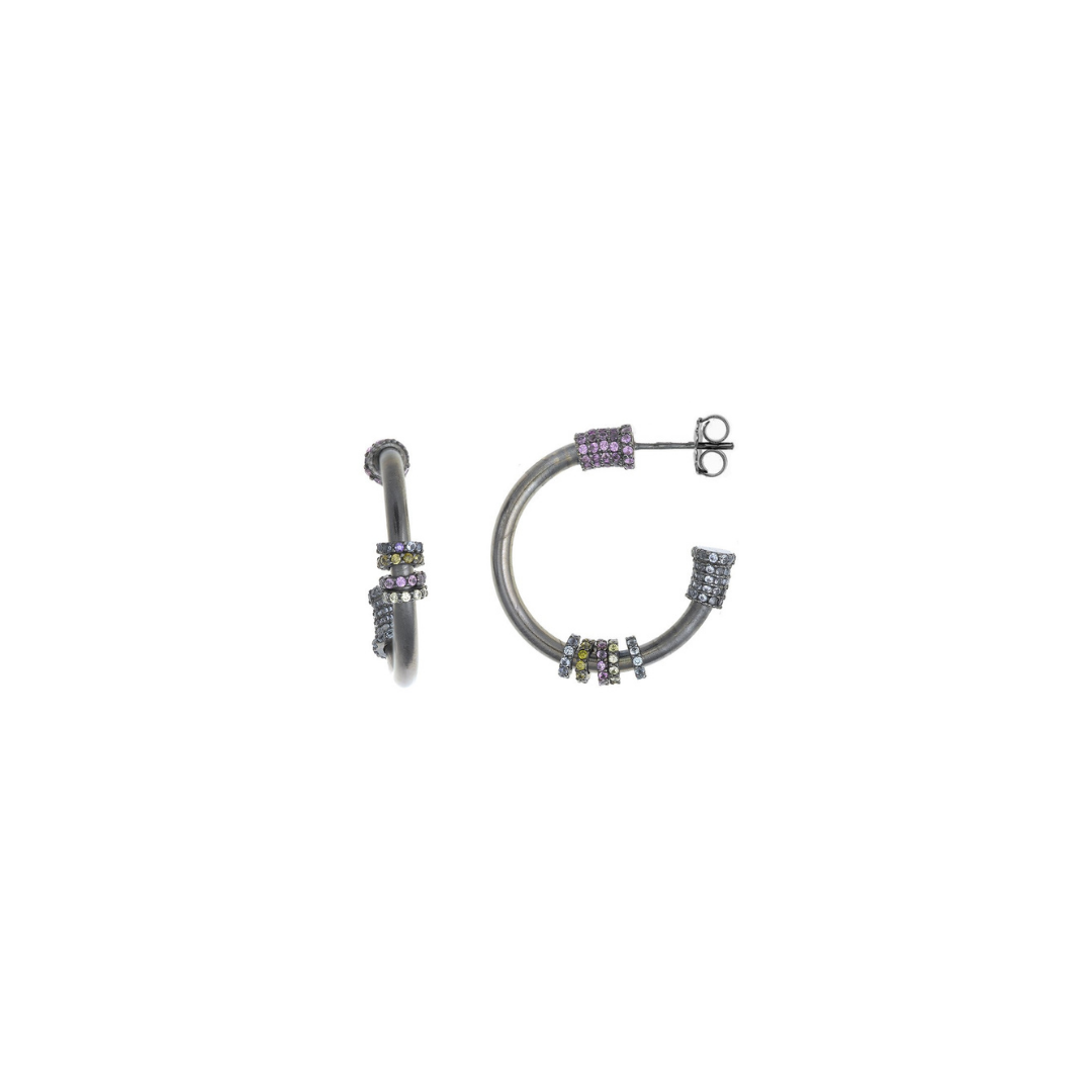 Aros realizados en plata de ley con apliques de circonitas en colores azules y morados y cierre de presión.Pendiente muy fácil de llevar y por su acabado de mate con piedras de color.