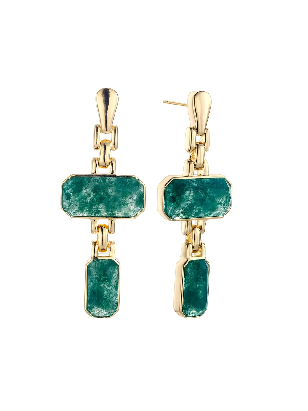 Pendientes de Durán Exquse (Edición Limitada) en plata con baño dorado y cierre de presión. Destacan por su ágata de musgo, perfecta para aportar un toque de color sofisticado.