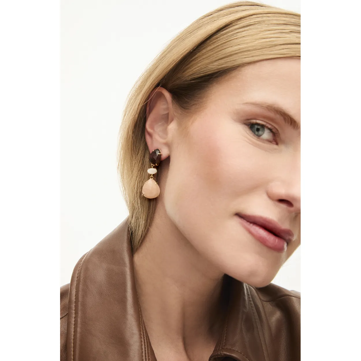 Pendientes de Durán Exquse (Edición Limitada) en plata con acabado dorado y cierre de presión. Combinan cuarzo ahumado, piedra luna blanca y calcita peach para un toque de color elegante y actual.