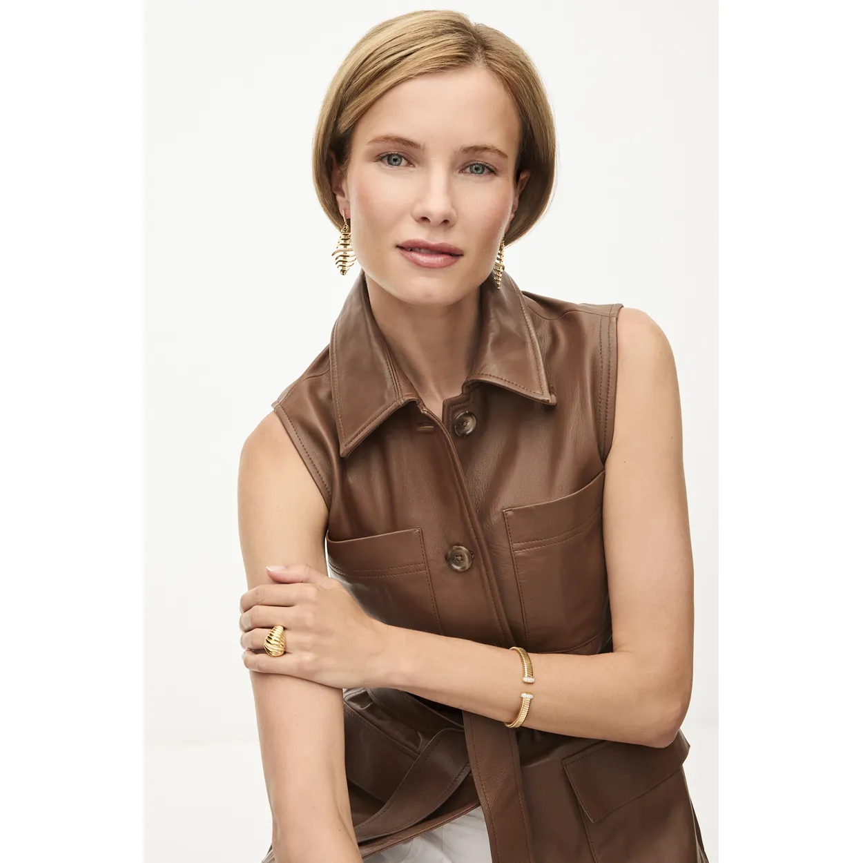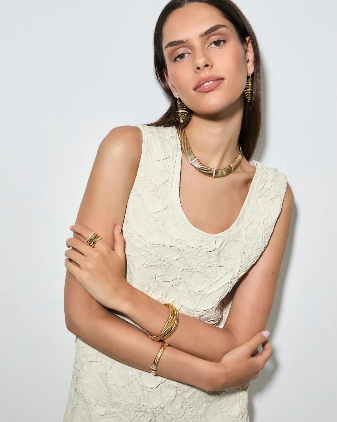 Pendientes de Durán Exquse de la cápsula Edición Limitada, elaborados en plata con baño dorado y cierre de presión. Diseño largo con topacios blancos que aportan brillo y un estilo sofisticado para eventos o looks especiales.