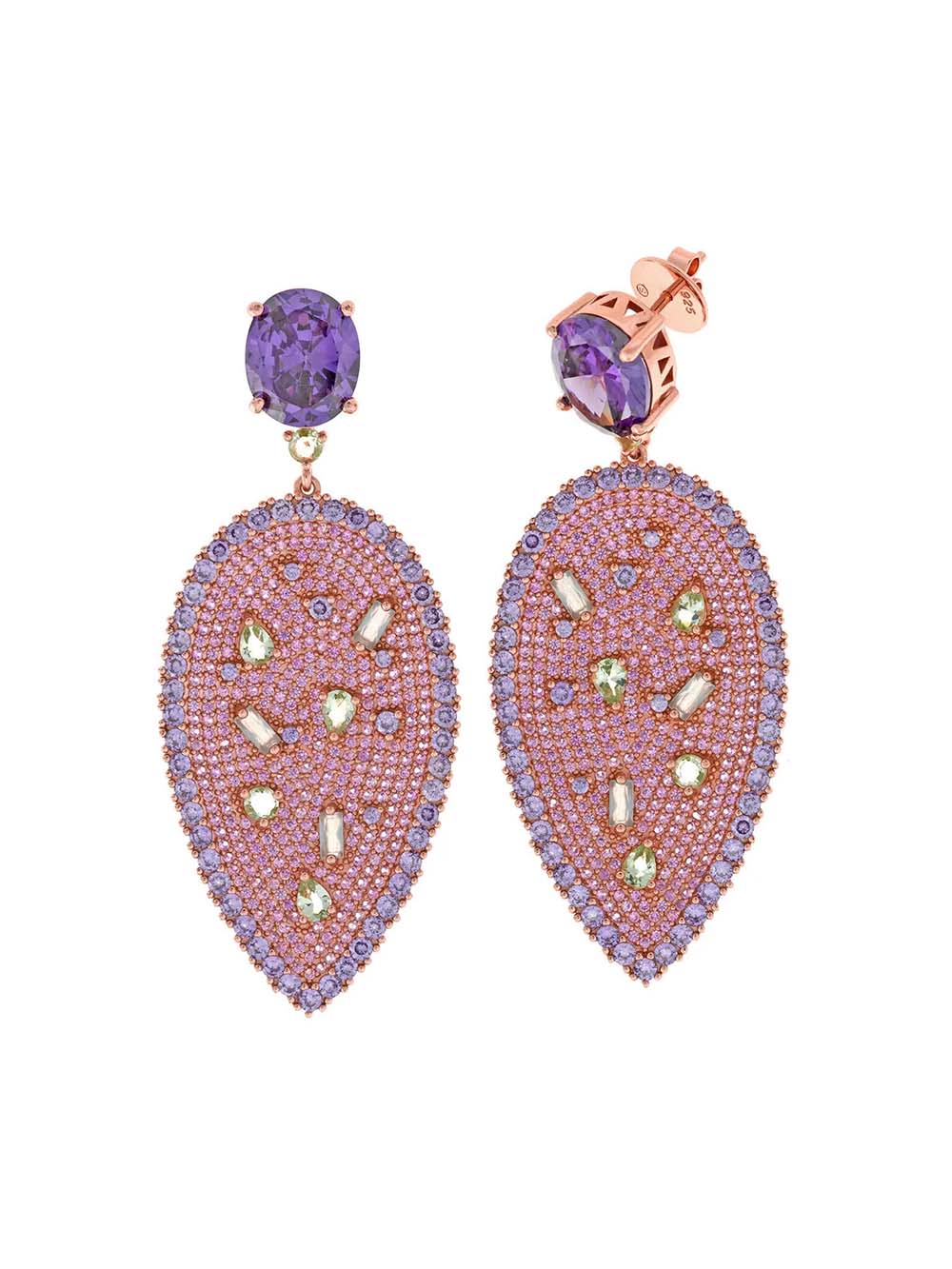 Pendientes chapados en rosa con hoja de cristal amatista oval y pavé de circonitas rosas, amatistas y verdes. Diseño original y elegante.