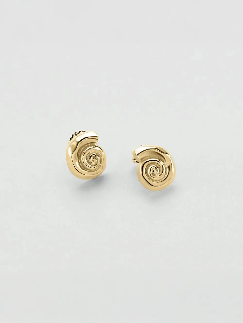 Pendientes dorados en forma de caracola, inspirados en el mar y el verano. Su diseño desenfadado los convierte en una pieza ideal para los días soleados.