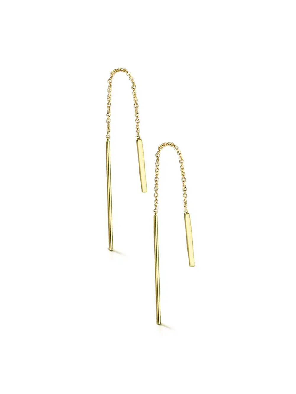 Pendientes LeCarré de diseño contemporáneo, formados por una barra plana que atraviesa el lóbulo y una cadenita fina que sostiene una barra redonda alargada. Realizados en oro de 18 quilates, aportan un look moderno y sofisticado.