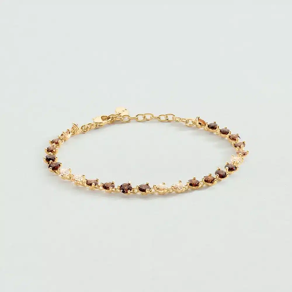 La pulsera de cadena Lutetia de Agatha Paris combina un acabado dorado con circonitas en tonos marrones, creando un juego de colores cálidos muy favorecedor sobre la piel. Su longitud ajustable permite adaptarla cómodamente a la muñeca, mientras los motivos con piedras aportan brillo y un toque sofisticado sin resultar recargados. Es una pieza ideal para quienes quieren incorporar los tonos tierra a sus joyas de diario.
