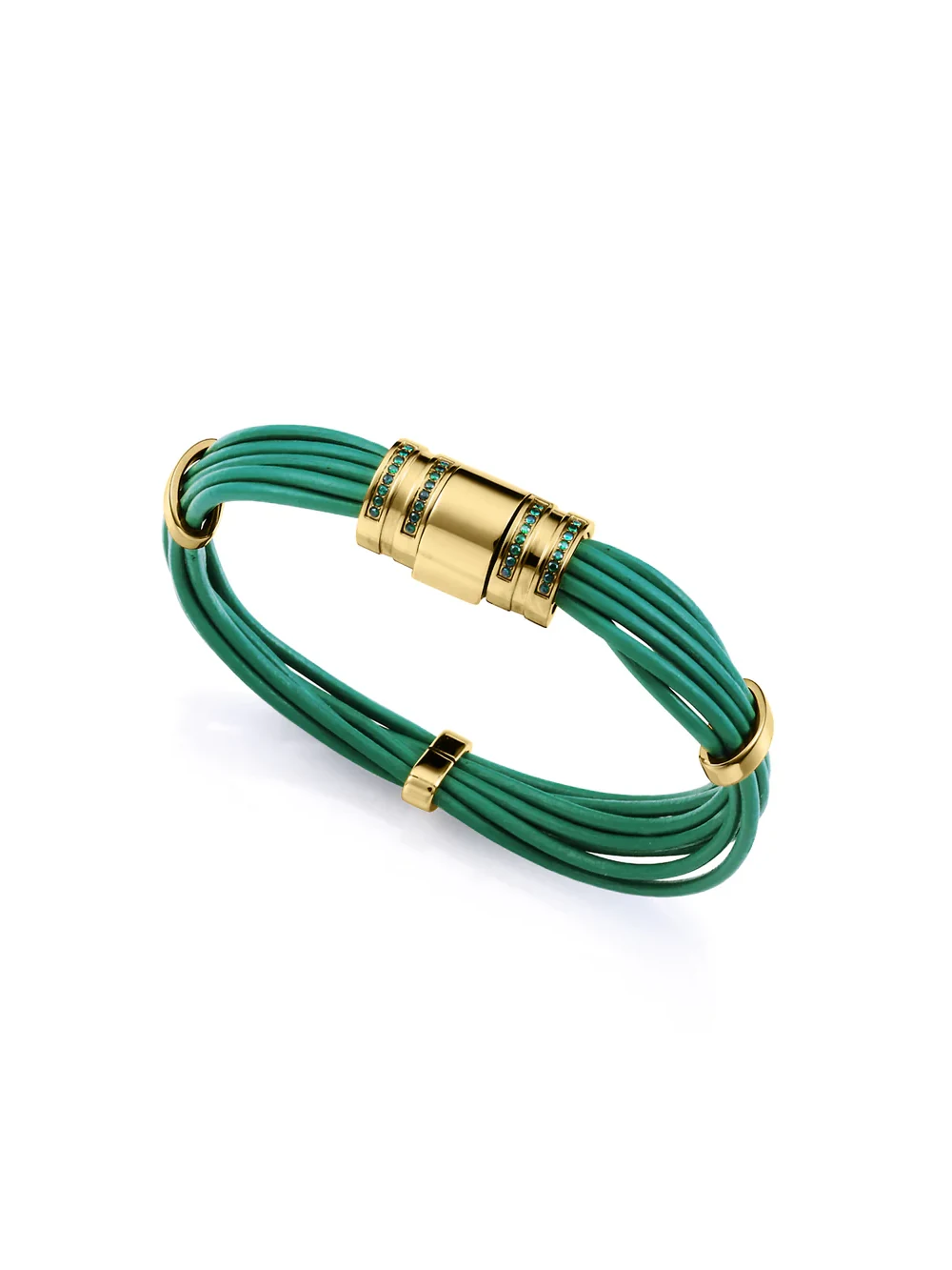 Elegante pulsera de acero con baño IP dorado que destaca por su innovadora fusión de materiales. Los insertos de piel en verde intenso aportan un contraste cromático lleno de vida y personalidad, rompiendo con lo convencional.