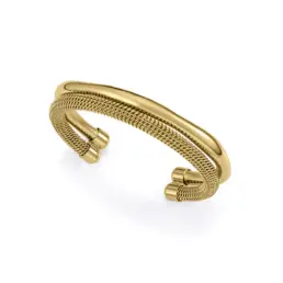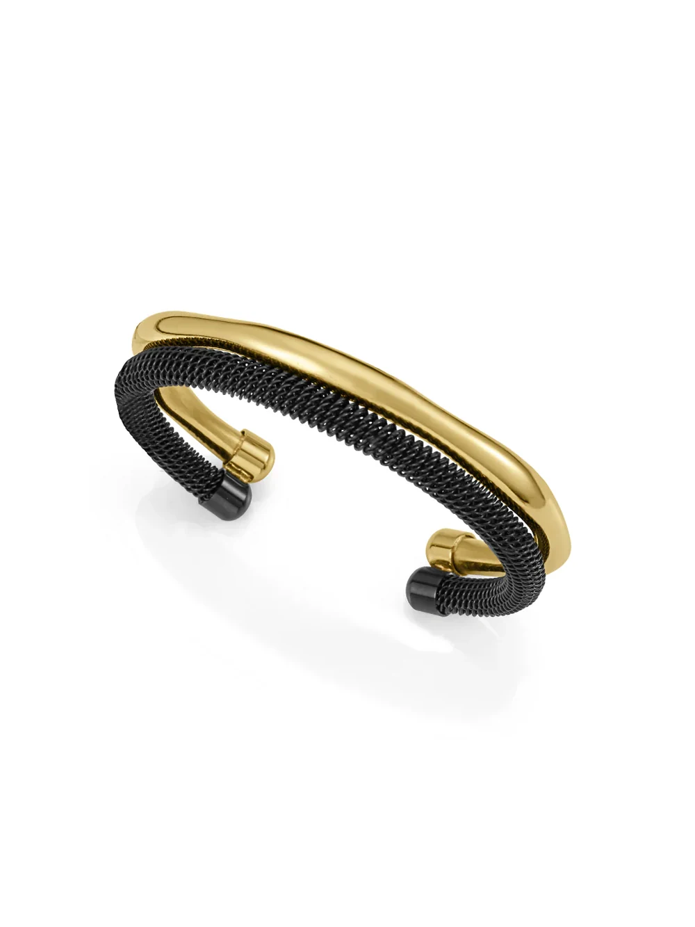 Destaca con esta pulsera rígida que juega con el contraste entre el dorado y el negro, creando un efecto visual sofisticado y contemporáneo. Fabricada en acero de alta calidad con doble acabado IP, esta pieza combina durabilidad y estilo en un diseño que no pasa desapercibido.