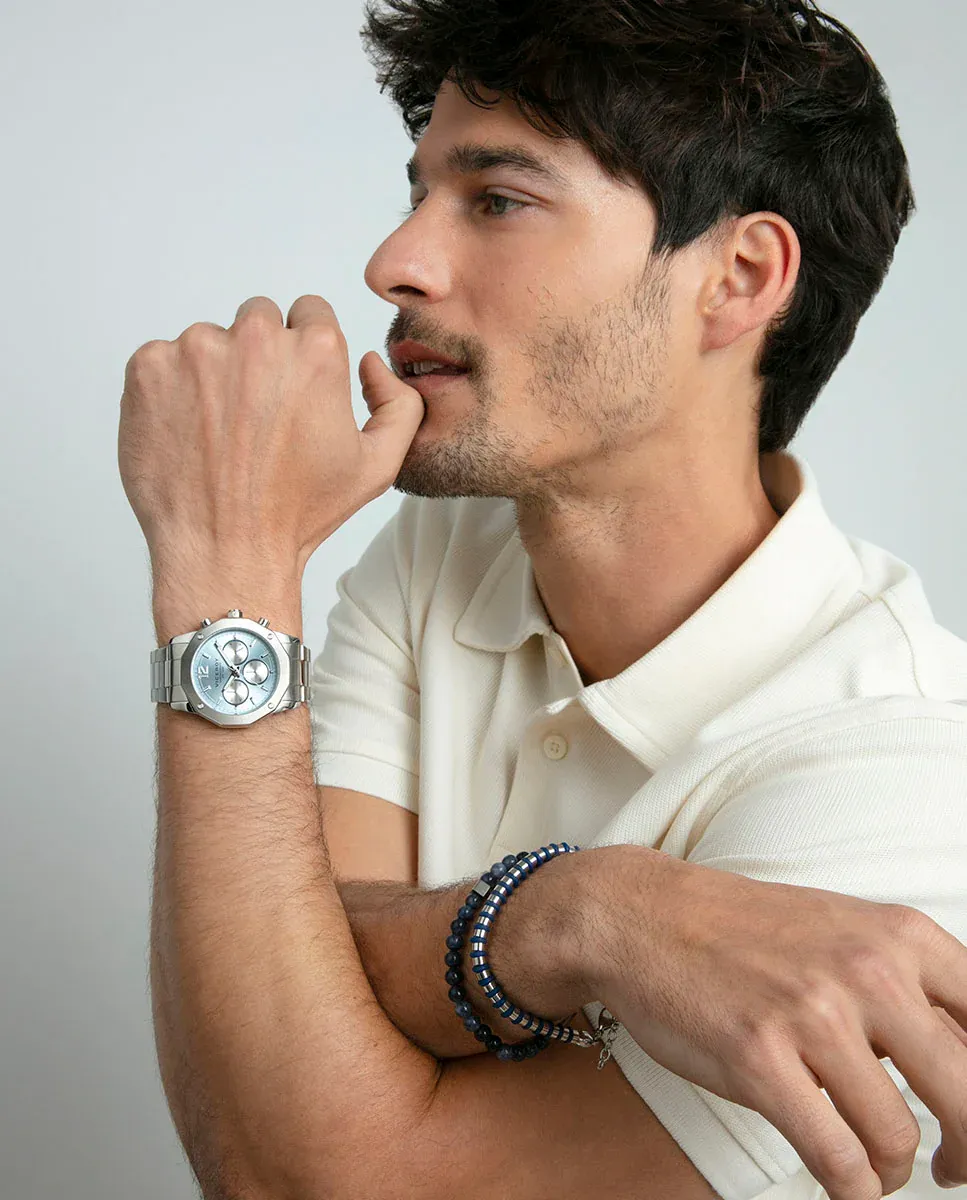Elegante cronógrafo Viceroy para hombre con caja y brazalete de acero. Esfera azul con índices y agujas plateadas, y subesferas técnicas. Resistente al agua hasta 10 ATM.