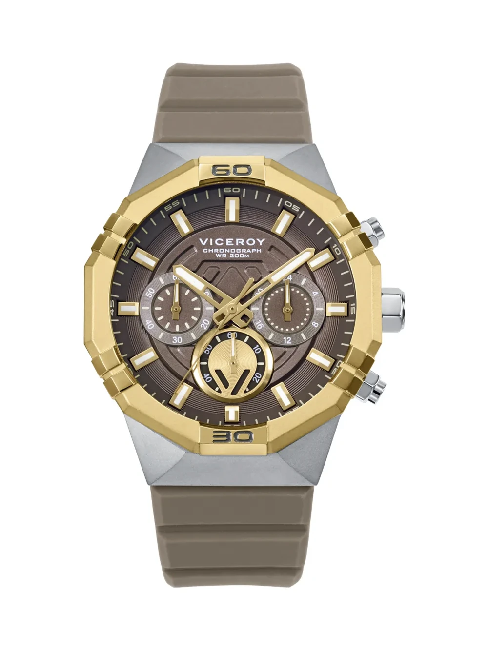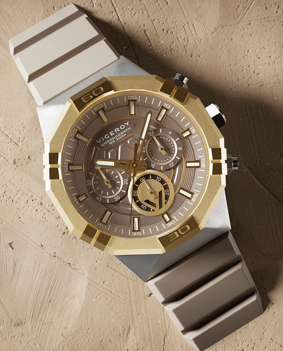 Reloj masculino Viceroy Neo con caja de acero, esfera marrón y función cronógrafo. Correa de silicona resistente y sumergible hasta 20 Bar.