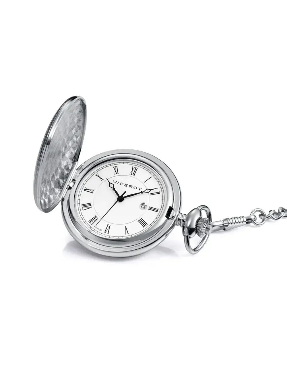 Reloj de bolsillo Viceroy con movimiento de cuarzo, tres agujas y calendario a las 3. Su caja metálica alberga una elegante esfera blanca decorada con números romanos, y unas agujas negras que facilitan la lectura. Un accesorio clásico que combina elegancia y funcionalidad, ideal para amantes del estilo tradicional.