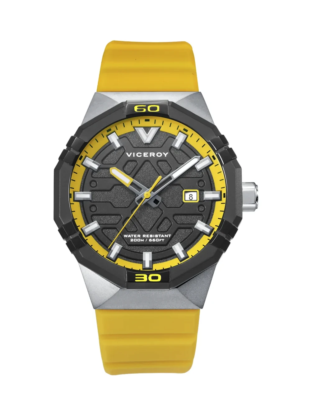 Viceroy Neo con caja de acero inoxidable y esfera negra, correa de silicona y cierre de hebilla. Incluye calendario y resistencia al agua de hasta 20 Bar.