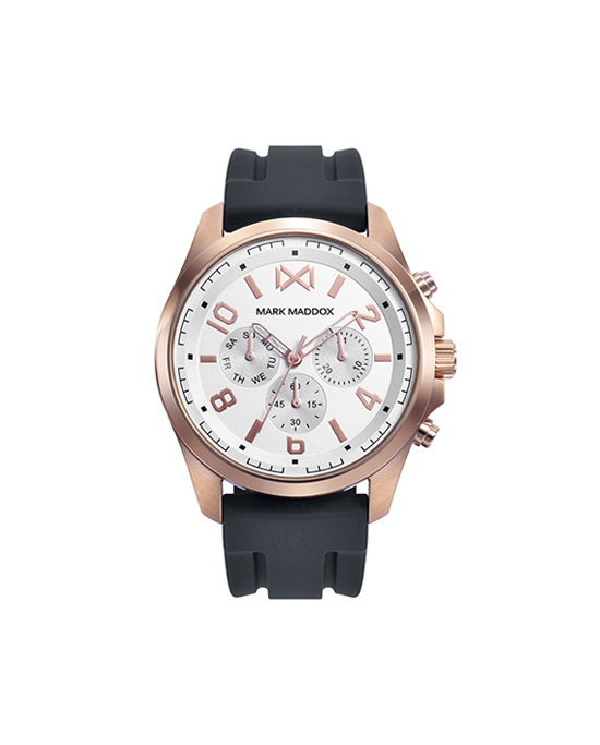 Reloj de la marca Mark Maddox para hombre. Caja de acero inoxidable rosado, dial blanco, agujas e índices rosados, multifunción y correa de goma negra.