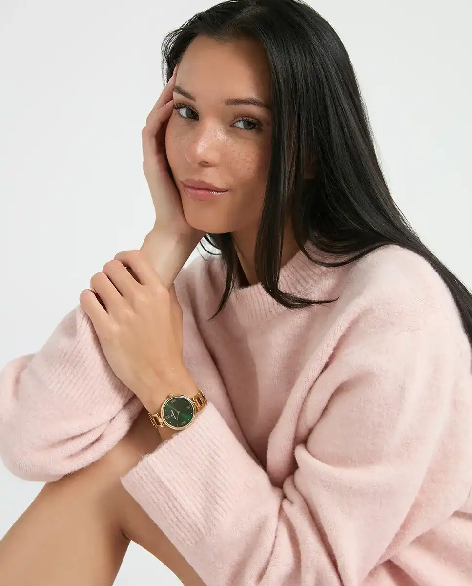 El verde esmeralda está en tendencia y aporta frescura. Resistencia al agua básica. Un reloj que destaca con elegancia.