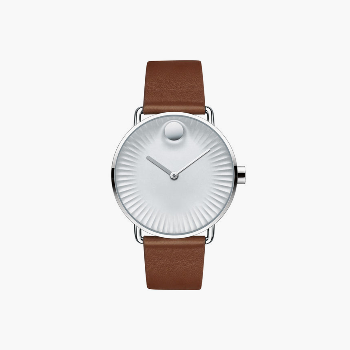 Reloj Movado Edge para hombres, caja de acero inoxidable pulido de 40 mm con orejetas estilo tubo, esfera de aluminio cóncava pulida con tono de plata con tono tonal elevado, borde esculpido con textura de rayos, manecilla de hora de acero inoxidable mate y manecilla de minutos de acero inoxidable pulido, Correa de cuero marrón medio que cae con hebilla de acero inoxidable pulido.