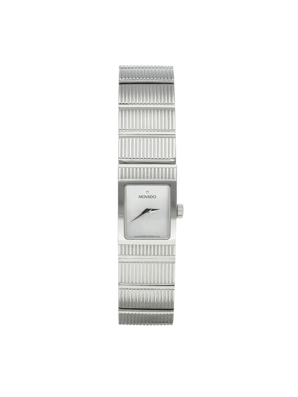 Reloj de pulsera Movado Concerto para mujer, diseñado con un estilo clásico y elegante. Caja de acero inoxidable de 17 mm en color plata con cristal mineral K1 resistente a arañazos. Movimiento de cuarzo suizo con funciones de horas y minutos. Esfera blanca sin marcas de hora. Pulsera de acero inoxidable con cierre tipo pulsera. Resistente al agua hasta 30 metros. Ideal para un look formal, casual o de lujo. Fabricado en Suiza. Garantía de 2 años por WatchWarehouse.