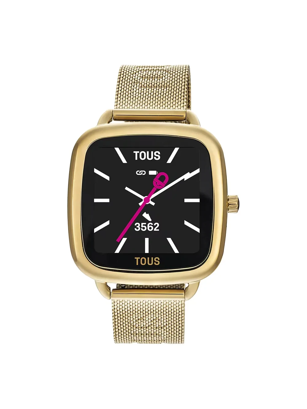 Smartwatch TOUS D-Connect en acero inoxidable IPG dorado con brazalete de malla milanesa y cierre de seguridad. Incluye pantalla táctil a color de 1,40 pulgadas, Bluetooth 5.0 y múltiples funciones como control de actividad, deportes, salud y notificaciones. Compatible con Android 7.0 e iOS 12.0 o superior. Impermeable IP68, batería de larga duración y esferas personalizables desde la TOUS WEAR APP.