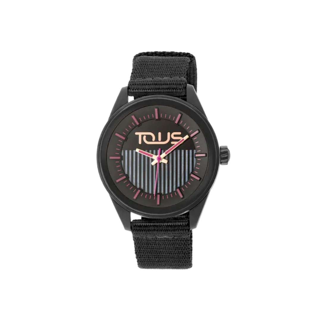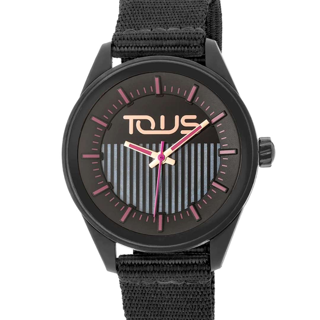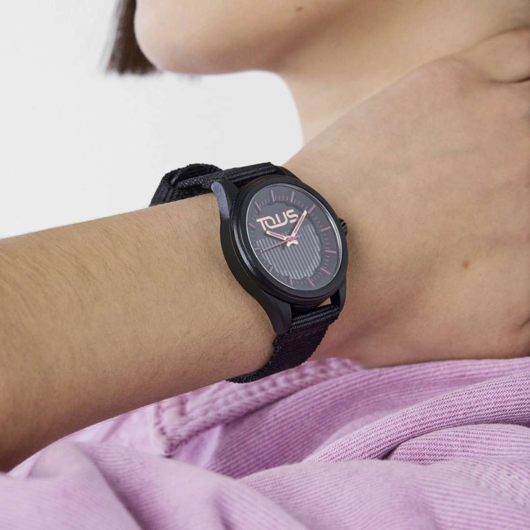 Reloj TOUS Vibrant Sun de carga solar con caja de nylon endurecido de color fucsia. La correa es de poliéster reciclada, fabricada a partir de botellas de plástico. No requiere de ninguna pila ni batería para funcionar; con una carga completa el reloj es capaz de funcionar hasta 4 meses.