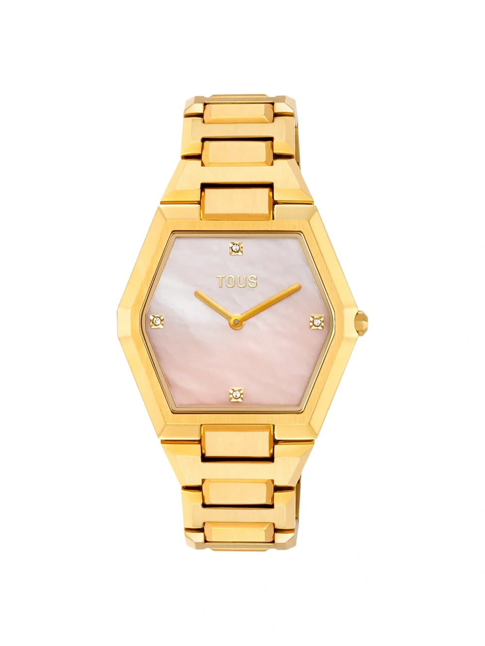 Reloj TOUS Karat con brazalete en acero dorado, esfera de nácar rosa con cristales facetados y cristal mineral octogonal. 3 ATM y cierre mariposa.