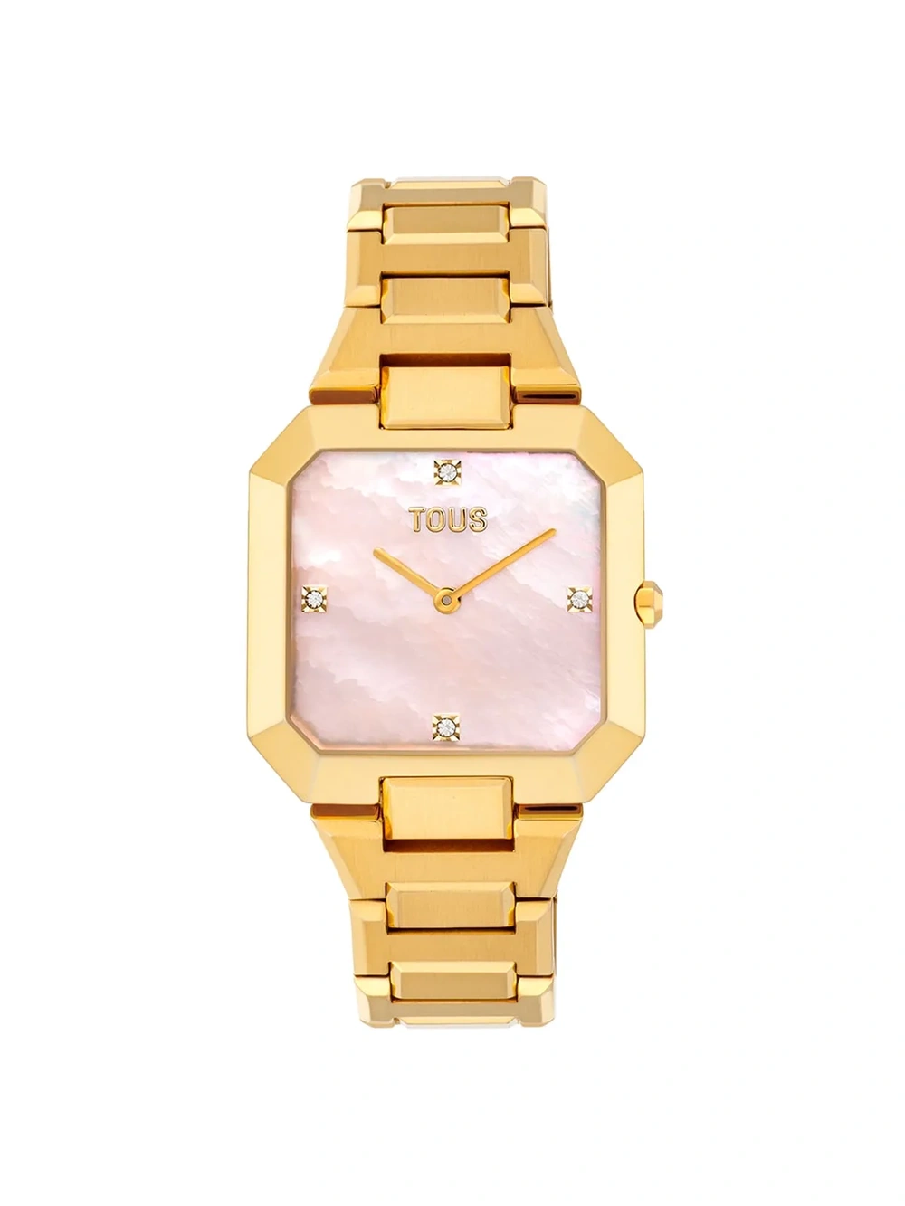 Reloj TOUS Karat con brazalete de acero dorado, esfera de nácar rosa con cristales en índices y cierre mariposa con pulsadores.