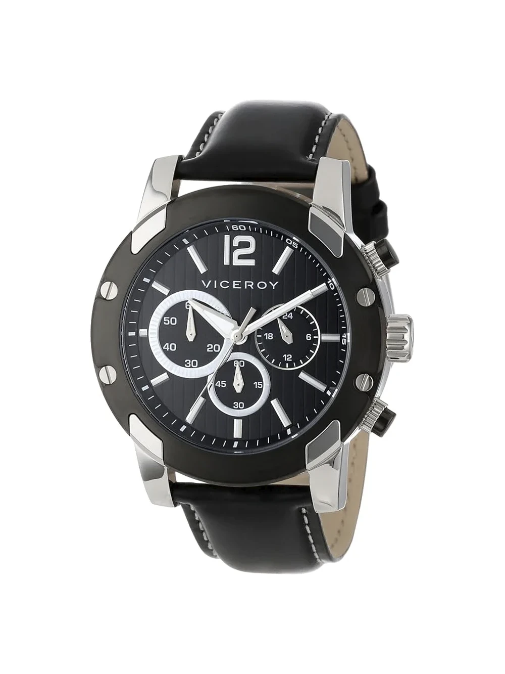 Reloj de hombre Viceroy con diseño deportivo y elegante. Caja de acero inoxidable con acabado bicolor IP negro que aporta un estilo moderno. Correa de piel negra de alta calidad. Equipado con funciones de cronógrafo, incluye horas, minutos y segundos para una mayor precisión. Cristal mineral resistente a los arañazos. Resistente al agua hasta 100 metros, ideal para el uso diario y actividades acuáticas ligeras.