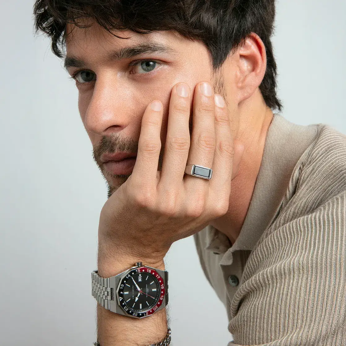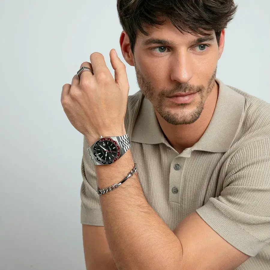 Reloj de estilo deportivo con caja y brazalete de acero inoxidable. El bisel rotatorio y la resistencia al agua hasta 10 ATM lo hacen funcional y atractivo. Su esfera gris con agujas e índices en plata, y el segundero rojo, crean un contraste dinámico. Una pieza que equilibra diseño moderno y rendimiento.
