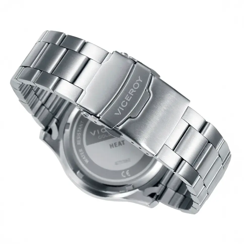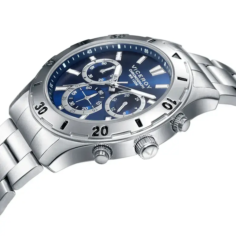 Reloj masculino de la colección Viceroy Heat, fabricado en acero con brazalete robusto y caja resistente. La esfera azul destaca con índices blancos de alta visibilidad. Incorpora función cronógrafo con subesferas a las 3, 6 y 9 horas y detalles deportivos en el bisel. Una elección elegante y funcional para el hombre actual.