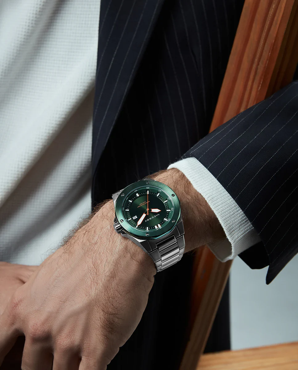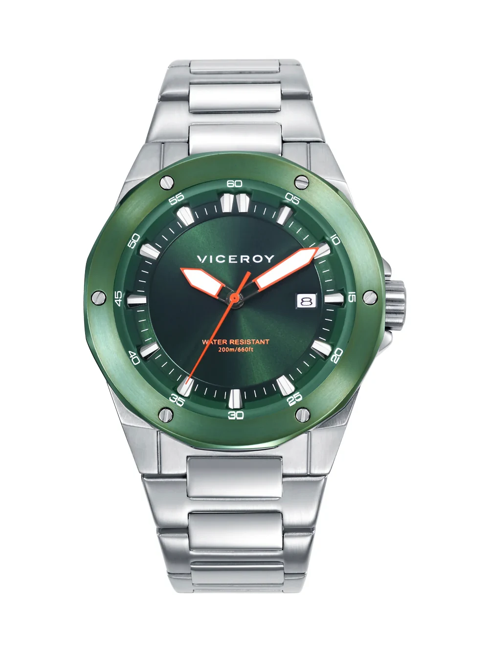 La intensidad del verde protagoniza este reloj deportivo Viceroy de 44 mm, diseñado para hombres que buscan diferenciarse. Su caja circular en acero con acabado bicolor IP verde y esfera a juego crean un conjunto visual impactante y lleno de energía.