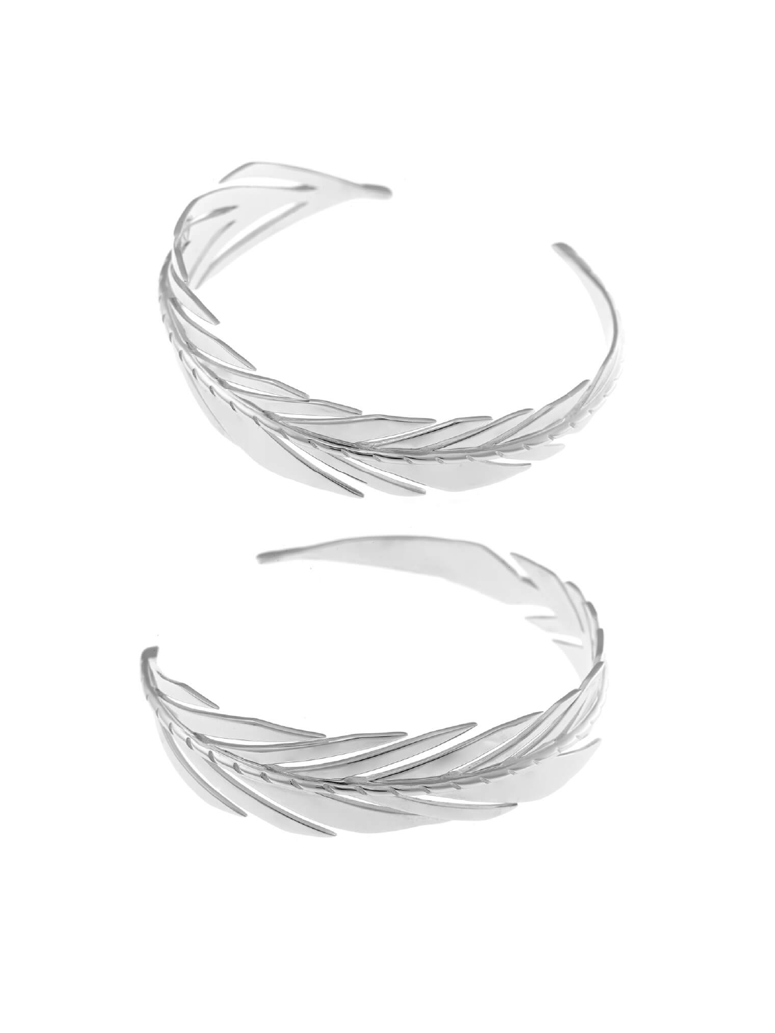 Pulsera de plata con baño de rodio. Pulsera de media caña con forma de hoja de areca, acabado brillo pulido.
