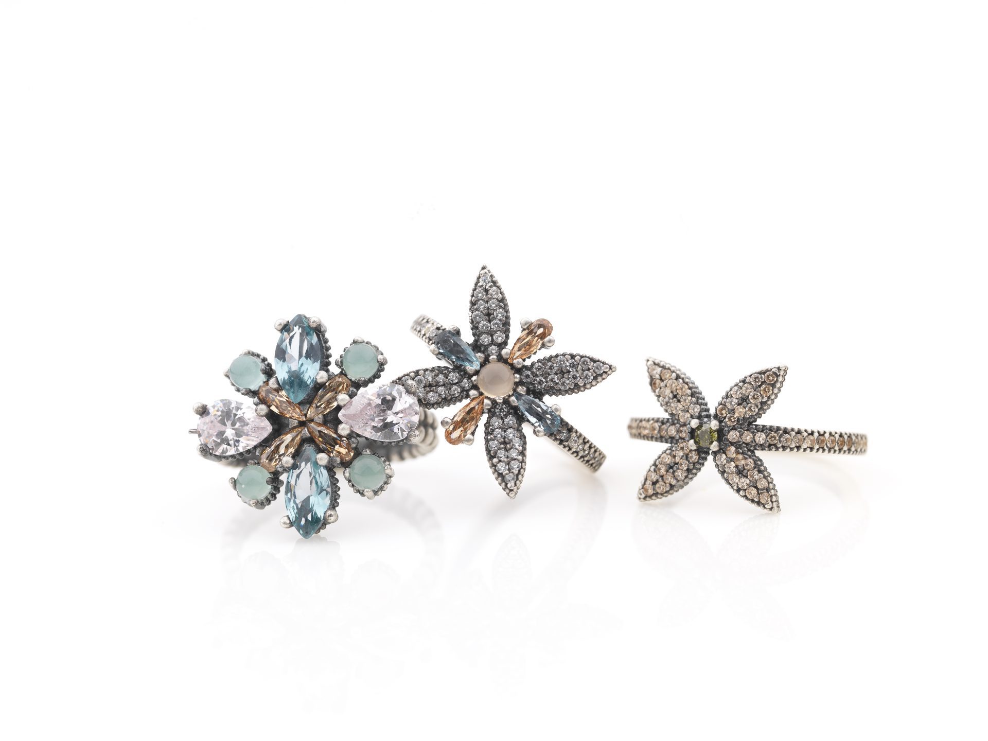 Anillo de plata de ley 925 con acabado envejecido, decorado con una original configuración de circonitas en tonos rosados, turquesa y miel, acompañados de unos cabujones en cuarzo calcedonia.