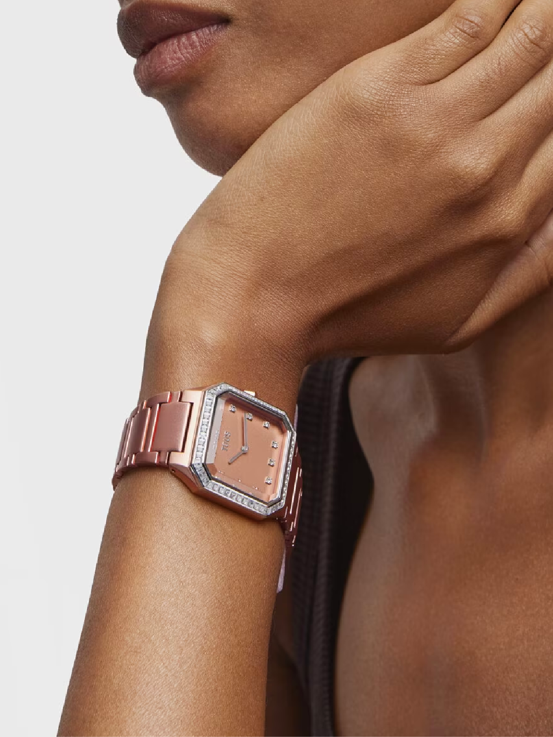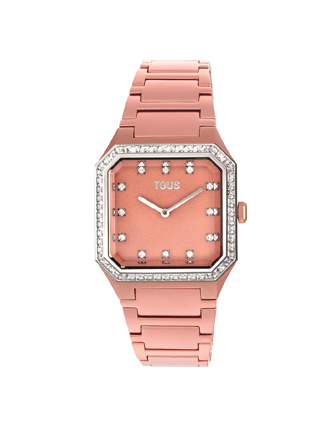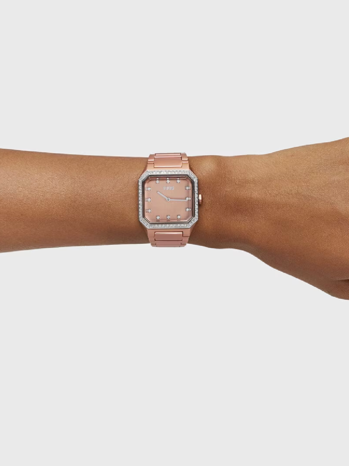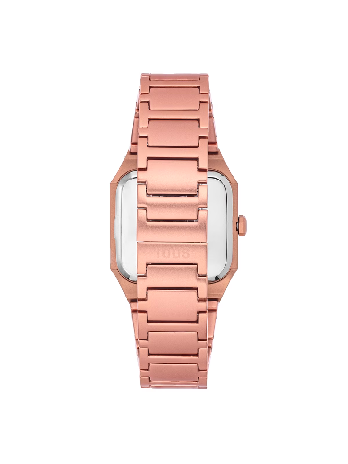 Reloj analógico TOUS Karat Squared con brazalete de aluminio anodizado en color rose gold. Dimensiones: 32,2 mm x 39 mm. Esfera de metal con cristales facetados en los índices y en el bisel 56 zirconias engastadas. Funciones: hora y minutos. Impermeable a 3 ATM. Batería: 1,55V Oxido de plata SR626SW/0,3 gramos. Movimiento cuarzo japonés. Cierre mariposa.