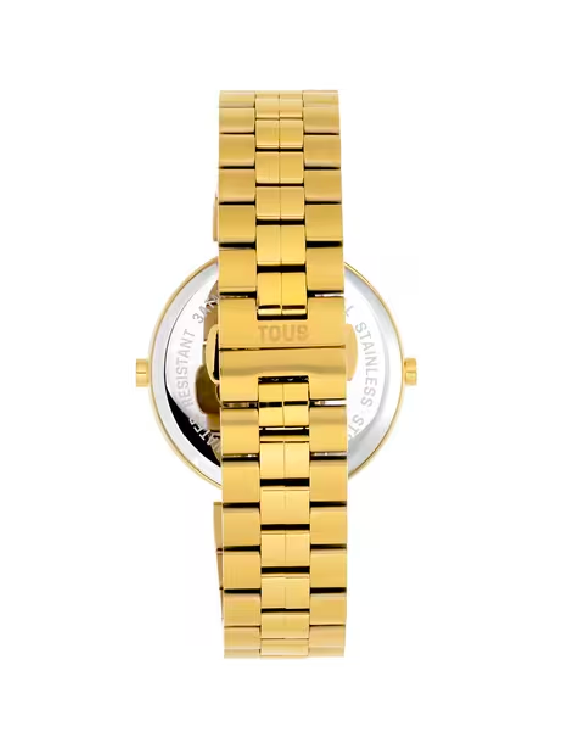 Reloj digital TOUS MARS con brazalete de acero IPG dorado y detalle de color rosa ubicado en la caja. Diámetro caja: 36 mm. Funciones: hora, minutos, segundos, día, mes y luz de fondo. Impermeable a 3 ATM. Batería: 1,55 alcalina LR1130 / 1,2 gramos. Cristal: mineral rectangular curvado. Cierre mariposa con pulsadores.