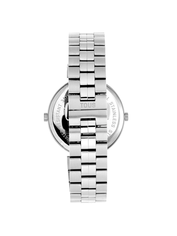 Reloj digital TOUS MARS con brazalete de acero y detalle de color azul marino ubicado en la caja. Diámetro caja: 36 mm. Funciones: hora, minutos, segundos, día, mes y luz de fondo. Impermeable a 3 ATM. Batería: 1,55 alcalina LR1130 / 1,2 gramos. Cristal: mineral rectangular curvado. Cierre mariposa con pulsadores.