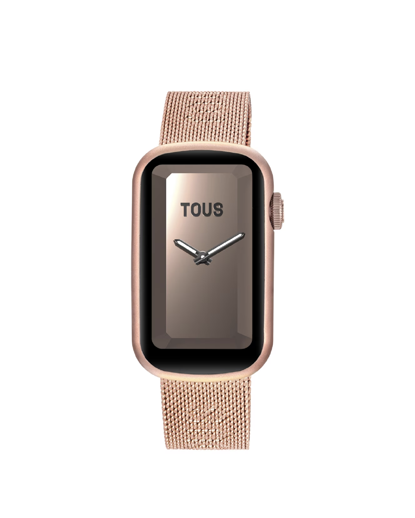 Reloj smartwatch TOUS T-Band Mesh con brazalete de acero inoxidable IPRG rosado y caja de aluminio en color rosado. Compatibilidad: Android 7.0 y iOS 12.0 o superior. Pantalla/LDC: táctil rectangular de 1,47 pulgadas TFT-DLC en color (Full Touch) con resolución de 172 x 320. Sistema operativo: RT OS. Conectividad: Bluetooth versión BLE 5.0. Ganancia de la antena: 0dbi. Memoria RAM: 128 kb, ROM Flash de 64 MB. Batería: capacidad 140 mAh, acumulador de batería 3.8V Litio/2,9 gr, recargable con cable magnético (min. 5V/1A), 5-7 días en funcionamiento y 8-10 en reposo. Chipset: Realtek RTL8762CK y Frecuencia cardíaca: HRS 3300- ARM Cortex-M3 – 53MHz de velocidad. Impermeabilidad: IP68. Funciones: 5 Esferas TOUS y una puede ser intercambiada desde la TOUS WEAR APP, horas, minutos, mes, día, día de la semana, actividad diaria con contador de pasos, contador de calorías y distancia recorrida en millas o kilómetros, deportes (caminar, correr, senderismo, ciclismo, cinta/elíptica, yoga y basquetbol), frecuencia cardiaca, monitorización del sueño, presión sanguínea (aproximación), oxígeno en sangre (aproximación), notificaciones (llamadas, WhatsApp, email, SMS, Facebook, etc.), clima, función ovárica, cronógrafo 1/10 segundos, control música, encontrar móvil y control cámara. Cierre de malla milanesa con cierre de seguridad.