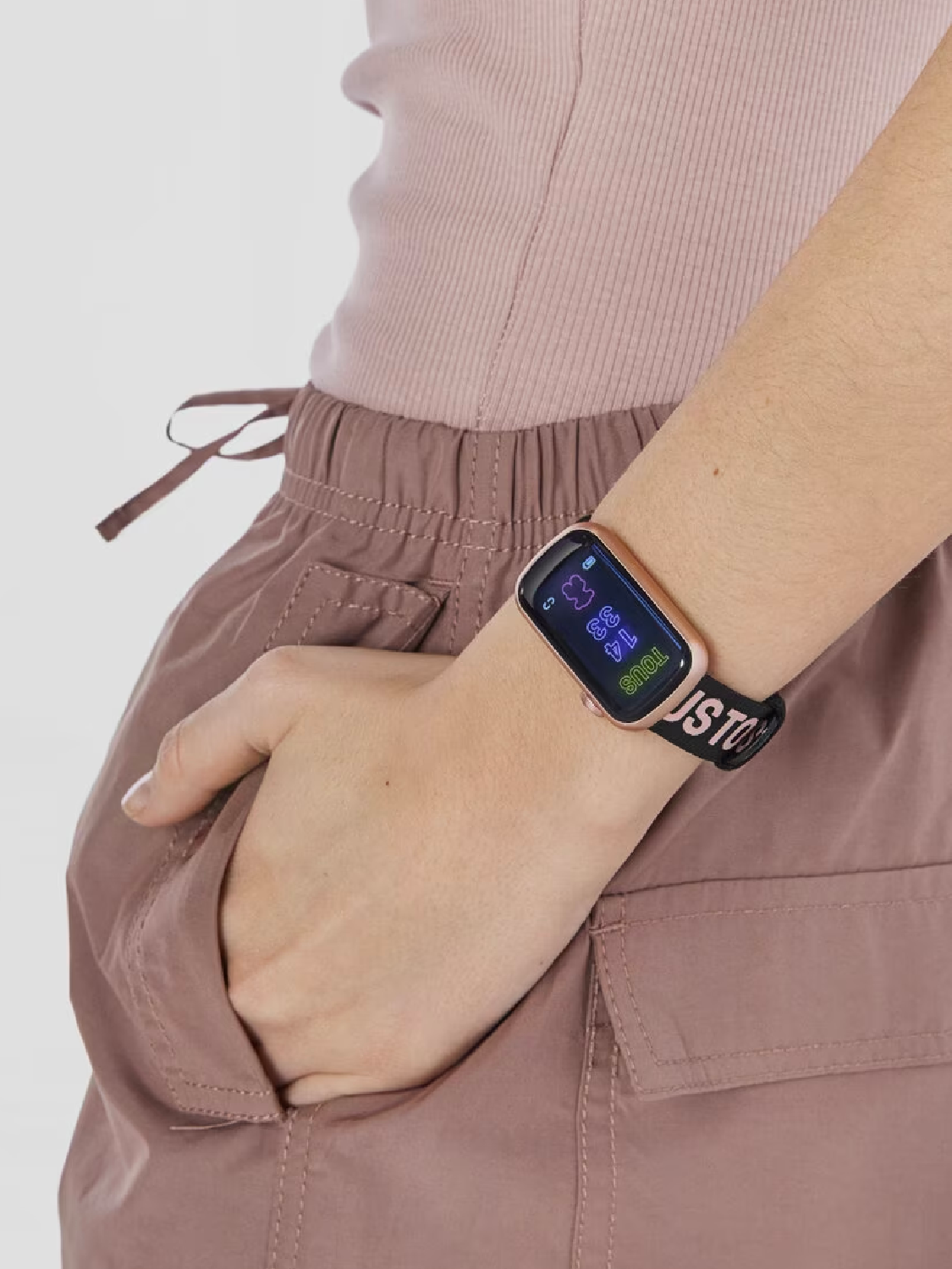 Reloj smartwatch TOUS T-Band con doble correa intercambiable y caja de PC rosado. Correa de nylon con logo rapport en rosa sobre base negra y correa de silicona en color rosa palo con oso posicionado. Compatibilidad: Android 7.0 y iOS 12.0 o superior. Pantalla/LDC: táctil rectangular de 1,47 pulgadas TFT-DLC en color (Full Touch). Sistema operativo: RT OS. Conectividad: Bluetooth versión BLE 5.0. Memoria RAM: 128 kb, ROM Flash de 64 MB. Batería: 140 mAh, acumulador de batería 3.8V Litio/2,9 gr, recargable con cable magnético, 5-7 días en funcionamiento y 8-10 en reposo. Chipset: Realtek RTL8762CK y Frecuencia cardíaca: HRS 3300- ARM Cortex-M0 – 53MHz de velocidad. Impermeabilidad: IP68. Funciones: 5 Esferas TOUS y una puede ser intercambiada desde la TOUS WEAR APP, horas, minutos, mes, día, día de la semana, actividad diaria con contador de pasos, contador de calorías y distancia recorrida en millas o kilómetros, deportes (caminar, correr, senderismo, ciclismo, cinta/elíptica, yoga y basquetbol), frecuencia cardiaca, monitorización del sueño, presión sanguínea (aproximación), oxígeno en sangre (aproximación), notificaciones (llamadas, WhatsApp, email, SMS, Facebook, etc.), clima, función ovárica, cronógrafo 1/10 segundos, control música, encontrar móvil y control cámara. Cierre hebilla de aluminio.